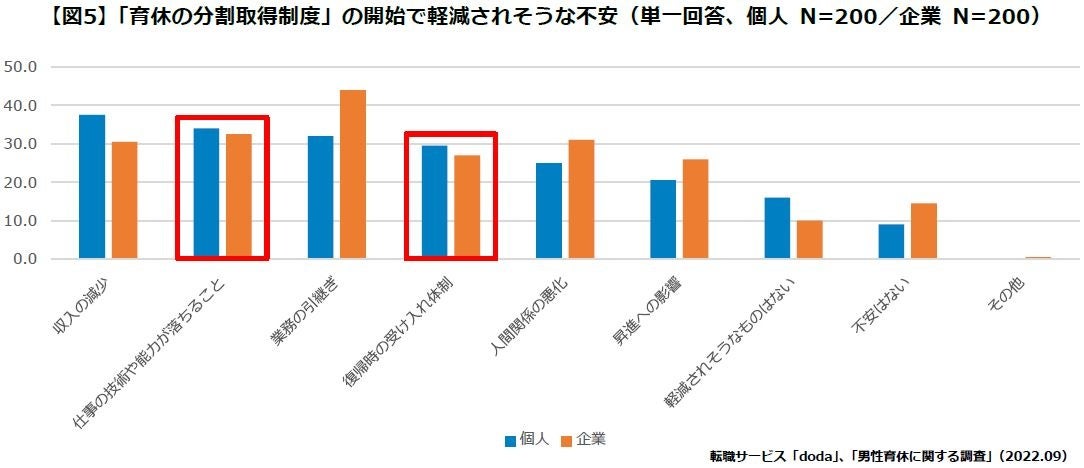 さらに、分割取得は、育休取得のしやすさだけにとどまらず、前述した取得時の不安軽減に繋がると期待されていることがわかりました。「育休の分割取得制度」の開始で軽減されそうな不安の内容を見ていくと、育休取得時の不安の回答の上位にあがっていた「収入の減少」や「業務の引継ぎ」だけでなく、「仕事の技術や能力が落ちる」(個人(34.0%)、企業(32.5%))や、「復帰時の受け入れ体制」(個人(29.5%)、企業(27.0%))という回答が一定数あったことから、分割取得が育休後の職場復帰のしやすさに好影響を与えると考えられていることが伺えます。(【図5】参照)