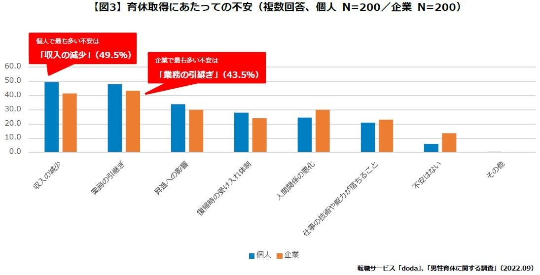 取得にあたって個人は「収入の減少」(49.5%)、企業は「業務の引継ぎ」(43.5%)を最も不安視している