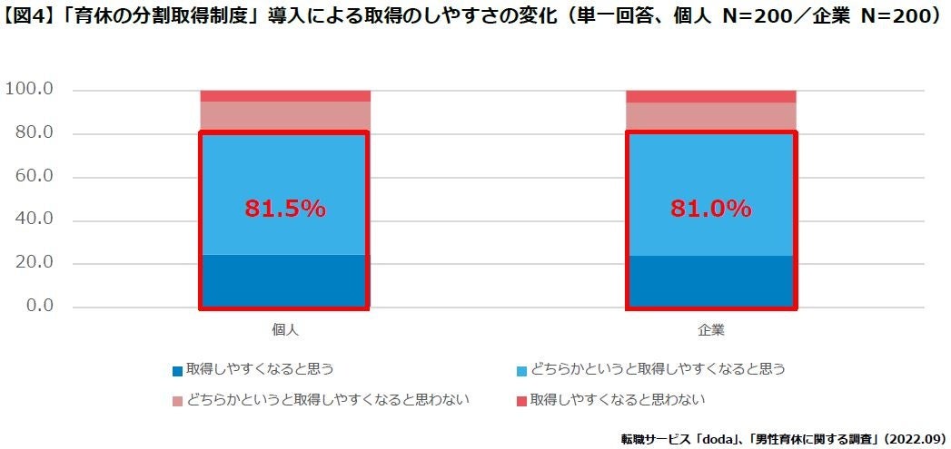 2022年10月に施行される法改正の「育児休業の分割取得」では、子が1歳になるまでの育児休業を分割して2回取得することが可能となります。そこで分割取得が育休取得にどのような影響を与えるかを調査したところ、個人・企業ともに8割以上が「育休取得しやすくなると思う」と回答しました。このことから本制度に期待感を持っていると推測されます。(【図4】参照)