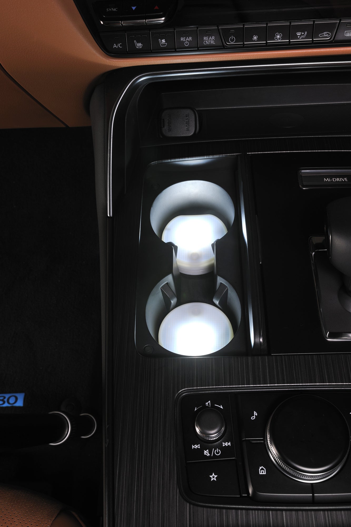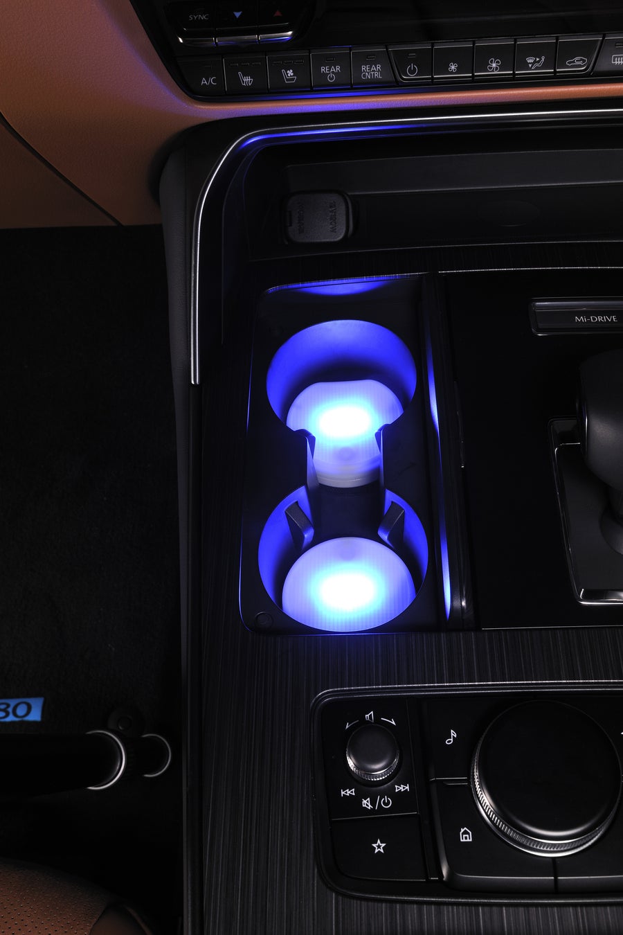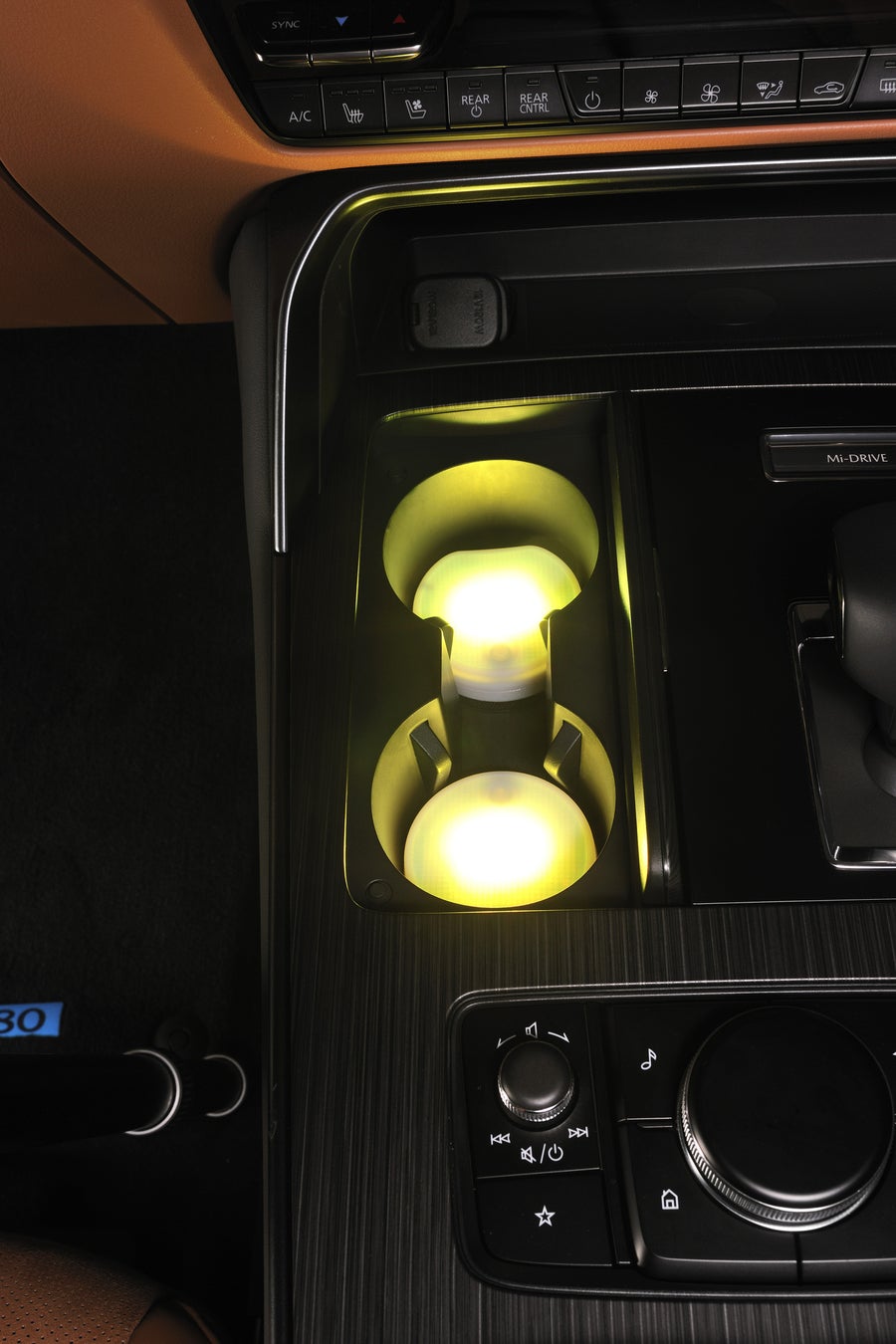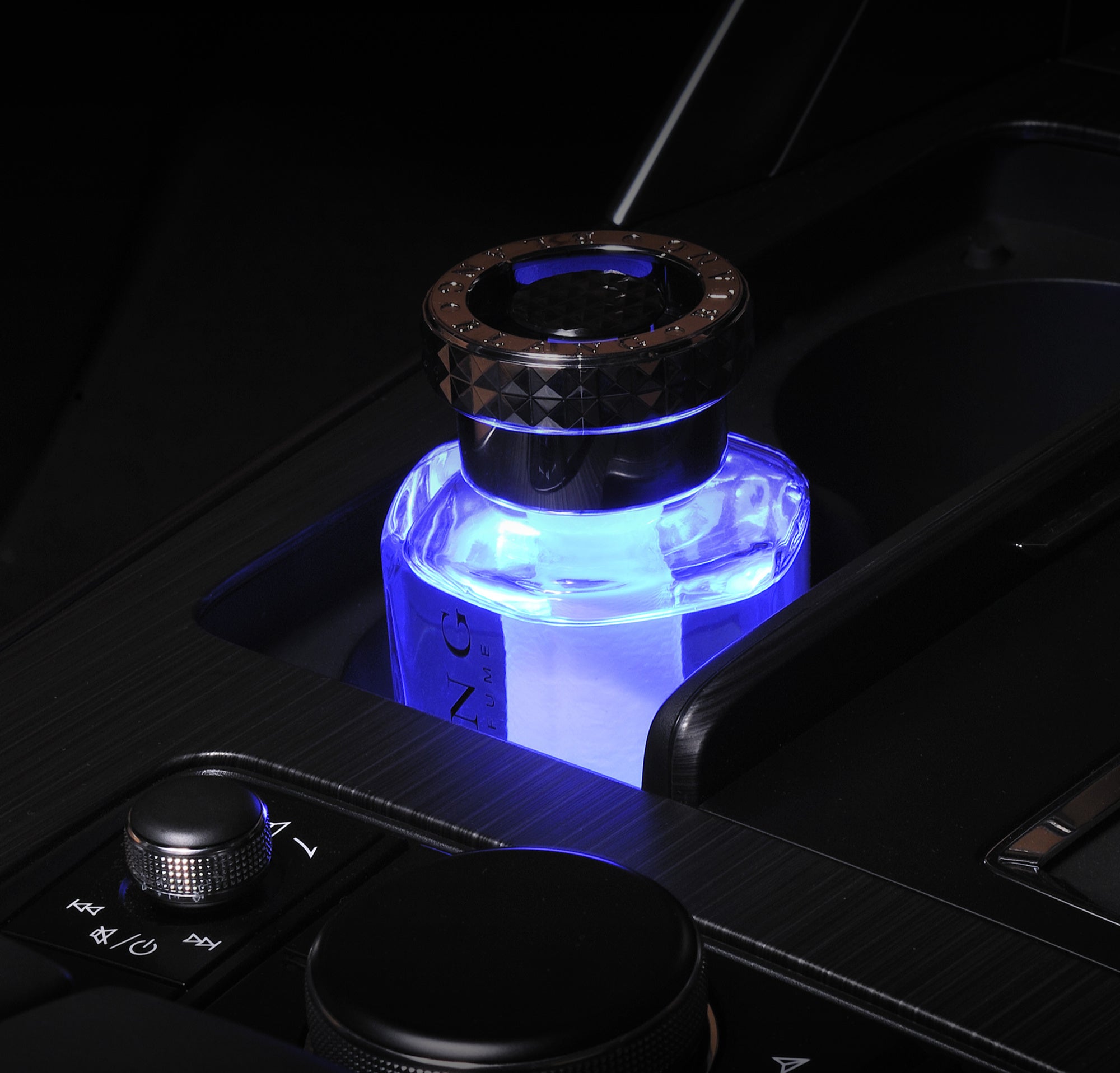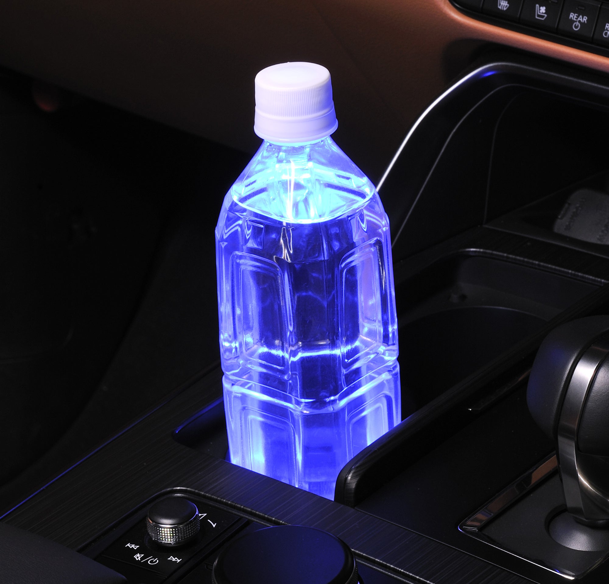 本製品の上に芳香剤やドリンクを置くと自動で点灯し、車内をスタイリッシュにドレスアップ。高輝度LEDの光がボトル全体を照らし、夜間の車内空間を鮮やかに演出 -