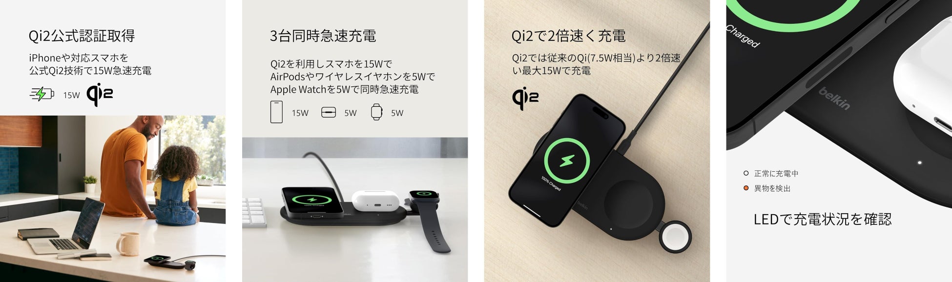 米カリフォルニア発、洗練されたデザインと快適なライフスタイル体験を提案し、グローバルで絶大な人気と市場シェアを誇るスマートフォン・PC関連製品ブランド「Belkin」の日本法人、ベルキン株式会社(以下Belkin、所在地:東京都中央区京橋)は、ワイヤレス充電の新規格である「Qi2」公式認証を世界で初めて取得した充電器シリーズより、Belkin Qi2 3-in-1ワイヤレス充電パッドを5月30日(木)よりAmazon.co.jpにて販売を開始します。
