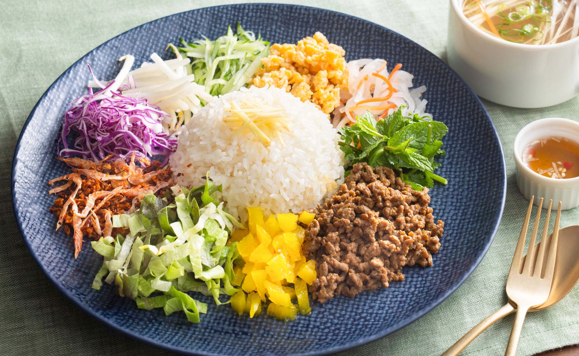 ベトナム発祥のまぜご飯。お好みで特製ダレをかけて、たっぷり野菜とライスをよく混ぜてお召し上がりください。見た目の美しさも楽しめる一品。