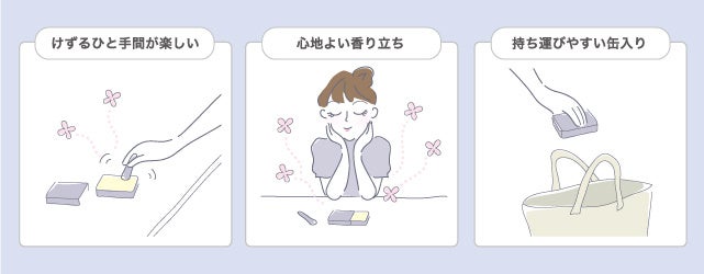 忙しい日々の中で、心を落ち着ける時間を作ってもらうために開発しました。「けずる」というひと手間をかけることで、パーソナルな空間で心地よく広がる香りや削り心地に癒され、心がほぐれていくのを感じます。上質な香料を贅沢に配合し、けずるだけで香りがやわらかく広がり、火も電気も使わないので、寝る前でも安心して使用できます。