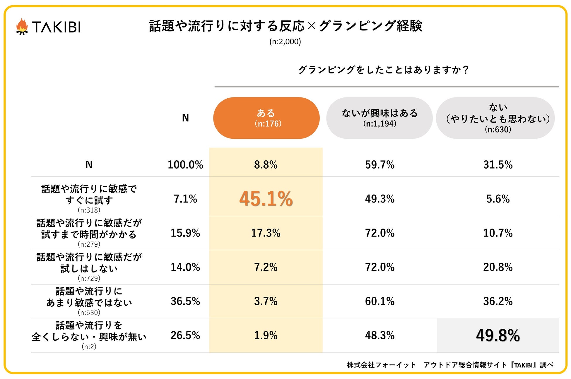話題や流行りに対する反応と、グランピング経験を掛け合わせて見ると、「話題や流行りに敏感ですぐに試す」人で「グランピングをしたことがある」と回答した人は45.1%となり、他の層と比較して大幅に上回る結果となりました。