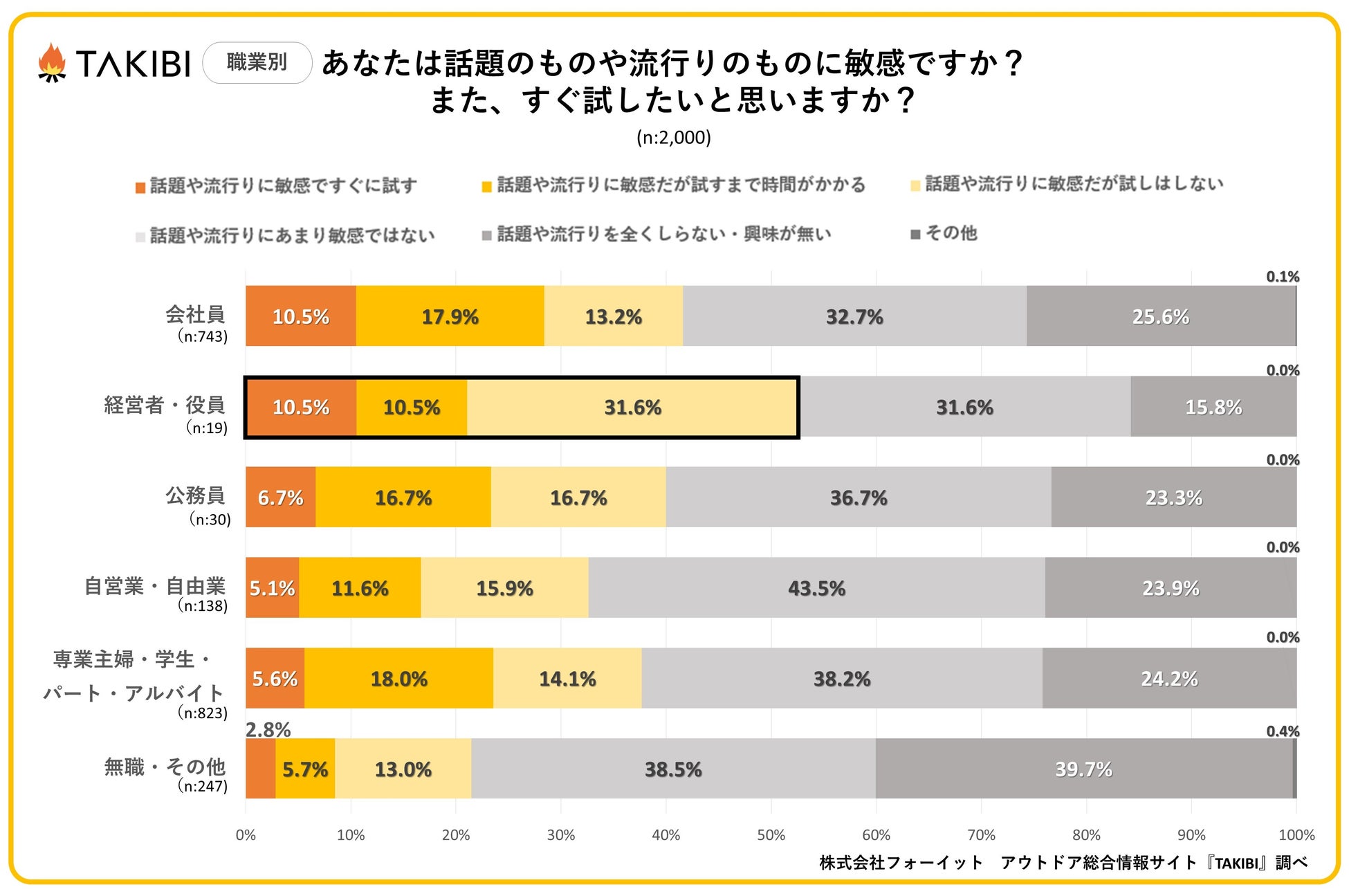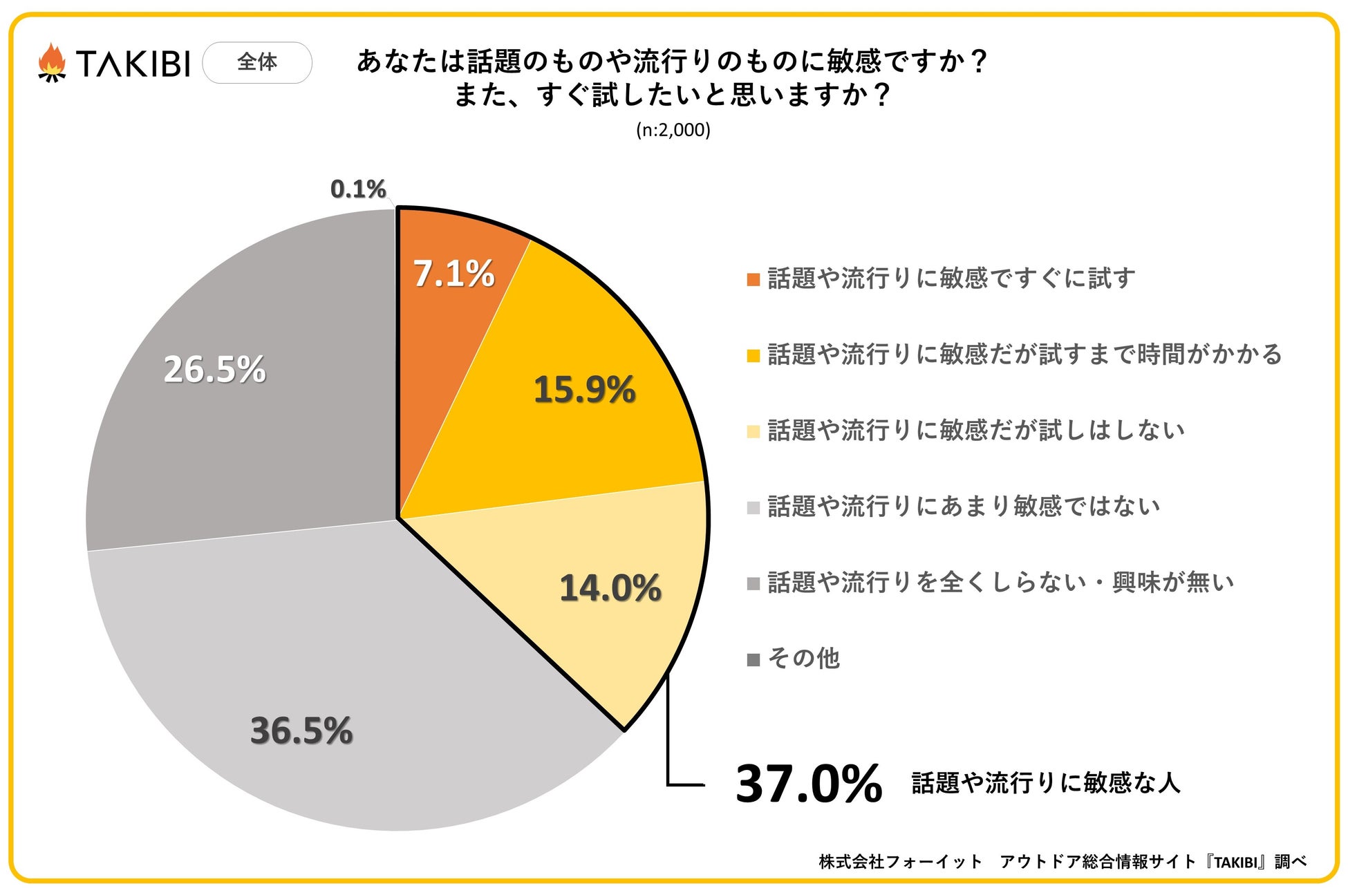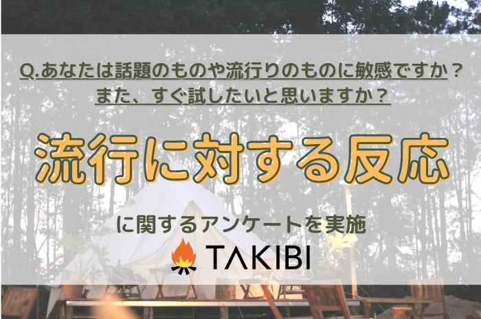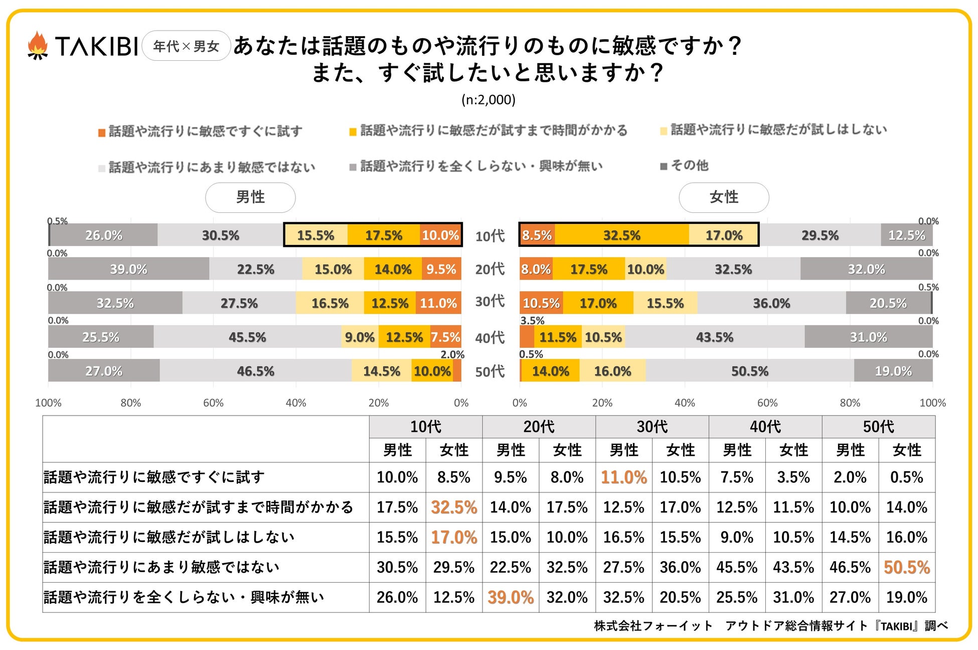 キャンプやグランピングを中心としたアウトドア総合情報サイト「TAKIBI」の運営をおこなう株式会社フォーイットは、全国の10代~50代までの男女2,000人を対象にトレンドに対する反応に関するアンケートを実施し、男女別・年代別等の特徴についてまとめました。