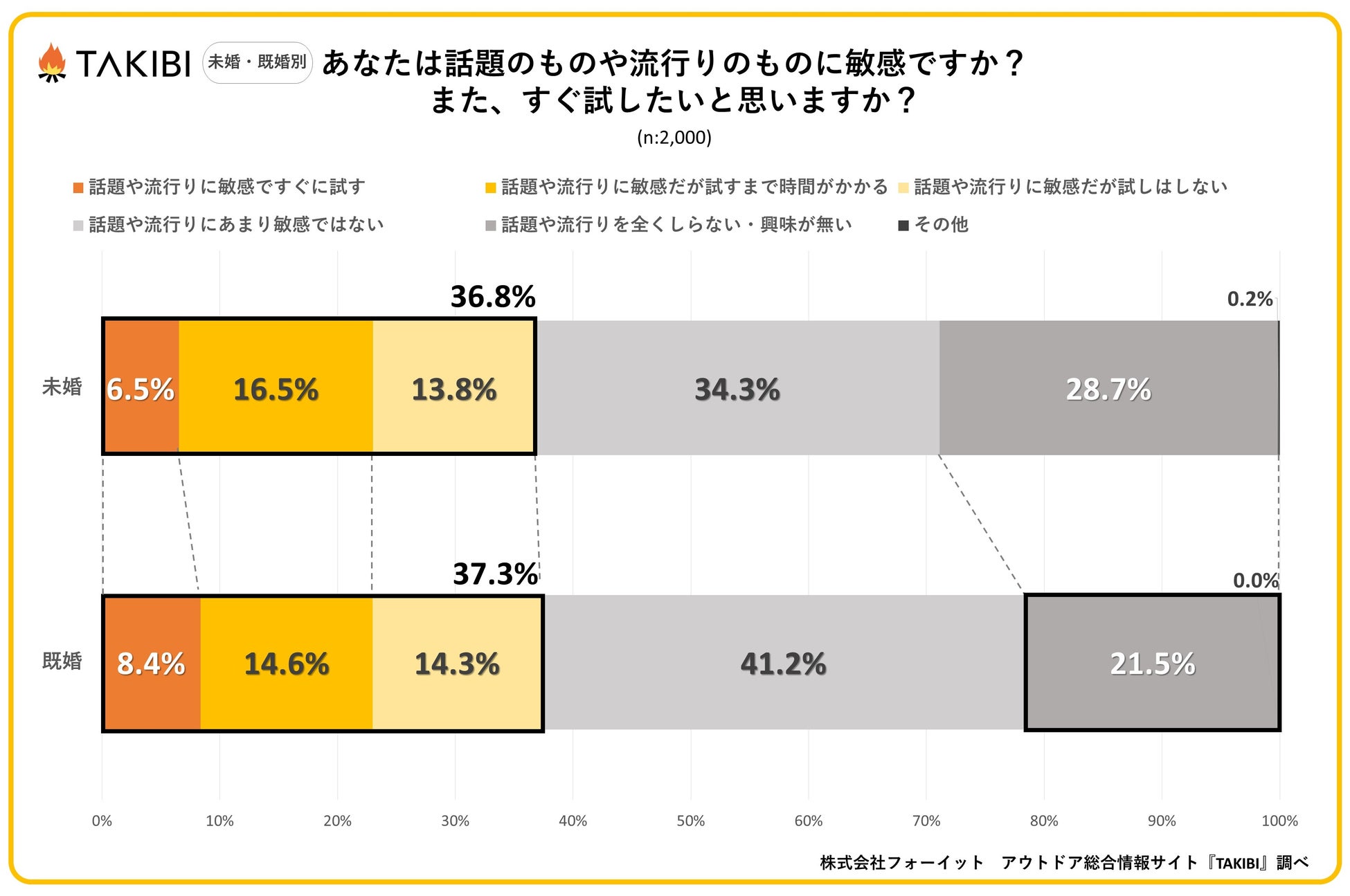 未婚・既婚別で見ると、「流行りに敏感」と回答した人は未婚者が36.8%、既婚者が37.3%と大差はない結果となりました。