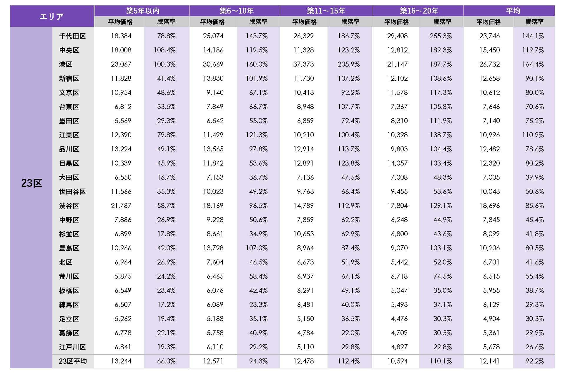 東京23区では全23区の半数近くとなる、千代田区、中央区、港区、新宿区、文京区、江東区、品川区、目黒区、世田谷区、渋谷区、豊島区の11区で平均価格が1億円を超え、千代田区と港区では平均価格が2億円を超えました。平均騰落率が最も高かった港区では新築分譲時プラス164.4%、2番目に高かった千代田区でも平均騰落率がプラス144.1%となり、上位の地域がプラス150%(新築時価格の2.5倍)前後の平均騰落率となりました。築年数別で最も騰落率が高かったのは千代田区の築16~20年で、平均騰落率がプラス255.3%(新築時価格の3.5倍)を超えました。区内のタワーマンションが騰落率の上昇をけん引しています。