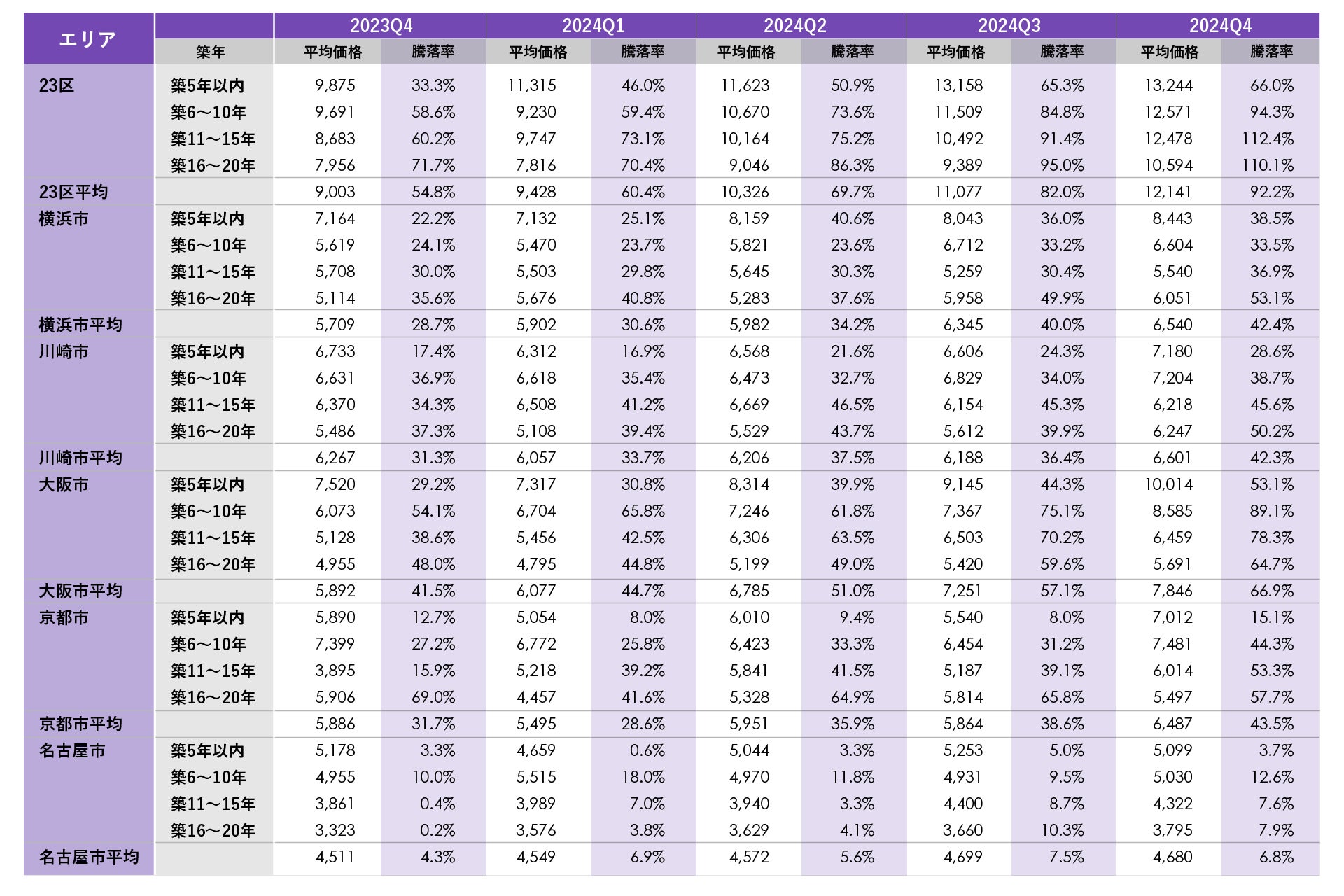 前期(2024年7~9月)比で価格はマイナス0.4~プラス10.6%、新築分譲時からの平均価格騰落率はマイナス0.7~プラス10.2ポイントでした。今回は名古屋市を除く5エリアで価格が上昇しました。平均騰落率が高いのは東京23区と大阪市で、ともに新築分譲時価格からの平均騰落率がプラス60%を超えています。前年同期(2023年10~12月)比で平均価格と平均騰落率が最も上昇したのは東京23区でした。築年数別で最も騰落率が高かったのは東京23区の築11~15年で平均騰落率プラス112.4%、次いで東京23区の築16~20年でプラス110.1%となり、23区の2つ築年数帯で平均騰落率がプラス100%(新築時価格の2倍)を上回りました。全体傾向としては、名古屋市で若干下落したものの、それ以外のエリアでは顕著な上昇傾向になりました。