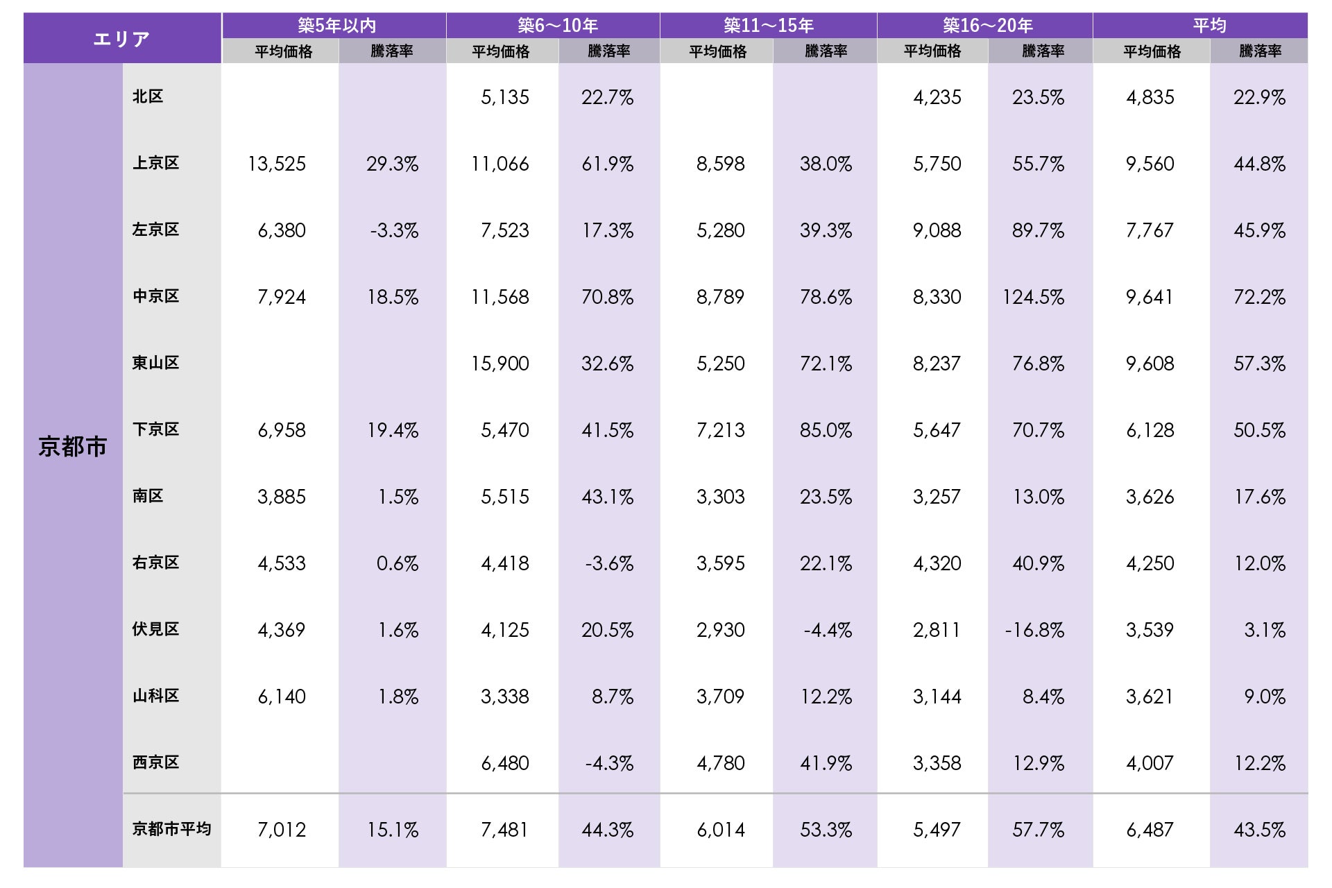 京都市では、上京区、中京区、東山区が平均価格9,000万円を上回りました。上京区、中京区、東山区は築10年以内で価格が1億円を越える物件が多く平均価格を押し上げています。平均騰落率が最も高かったのは中京区の新築分譲時プラス72.2%でした。