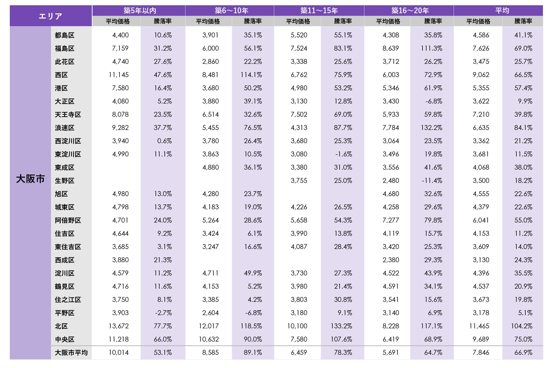 大阪市で平均価格が最も高かったのは北区の1億1,465万円で、市内で唯一平均価格が1億円を上回りました。平均騰落率も北区が新築分譲時プラス104.2%で最も高くなりました。梅田周辺のタワーマンションや大規模マンションの価格が新築時と比べて大きく高騰していることが要因です。