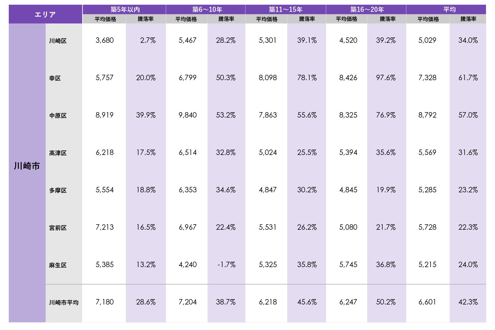 川崎市の平均価格は6,601万円で前期比プラス6.7%(プラス412万円)、前年同期比はプラス5.3%(プラス333万円)でした。流通した住戸の新築時からの平均騰落率はプラス42.3%で前期比プラス5.9ポイント、前年同期比プラス11.0ポイントとなりました。