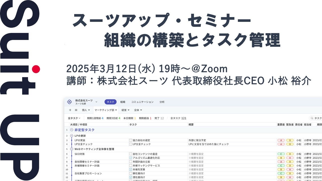 株式会社スーツ(所在地:東京都千代田区、代表取締役社長CEO:小松 裕介)は、2025年3月12日(水)19時から、当社代表の小松が講師を務めるスーツアップ・セミナー「組織の構築とタスク管理」を無料開催します。