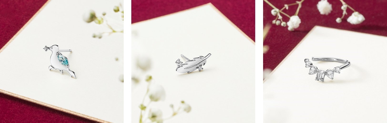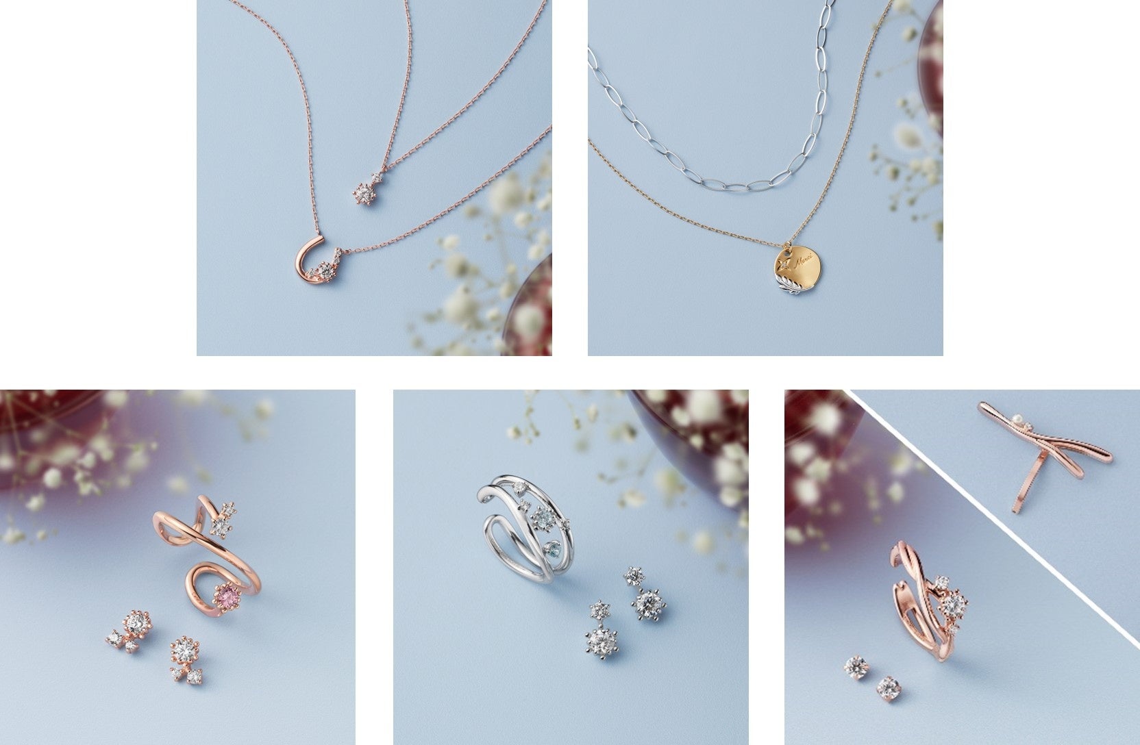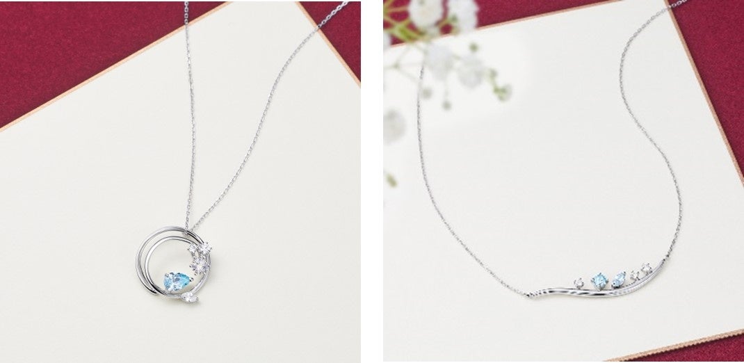 シルバーとピンクゴールドの地金に、幸運をもたらすとされるフェルスパーなどの透明感あふれるストーンをセッティングした冬らしいジュエリーは、かすみ草や幸せの青い鳥、クリスマスオーナメントをイメージしてデザインしました。クリスマスへ向けて心を高鳴らせる、輝き溢れるアイテムが揃います。