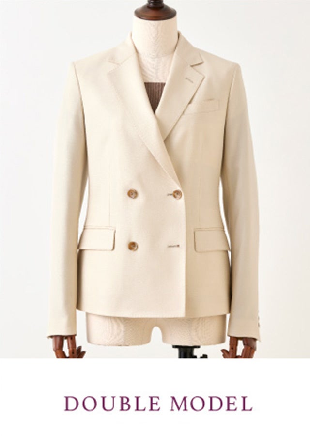 トレンドのダブルジャケットモデル。女性らしい優美なラインを演出し、カジュアルでスマートな雰囲気を出せる1着。