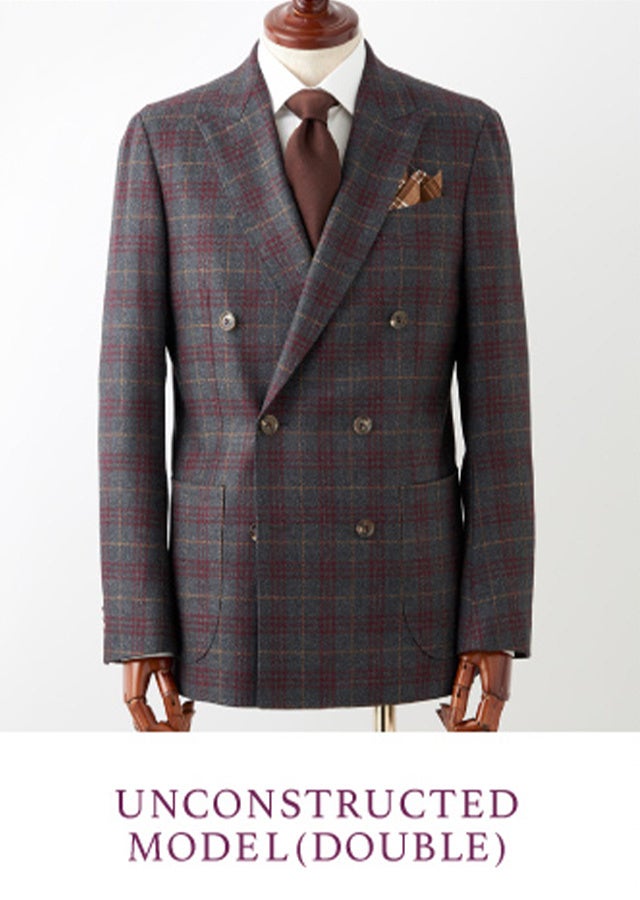 ダブルの重厚感を保ちつつ、軽さと柔らかさを追求したモデル。ハイゴージでシャープなラペルライン、極限まで少なくした副資材で、ニットやジャージのカーディガンのような着心地を実現。