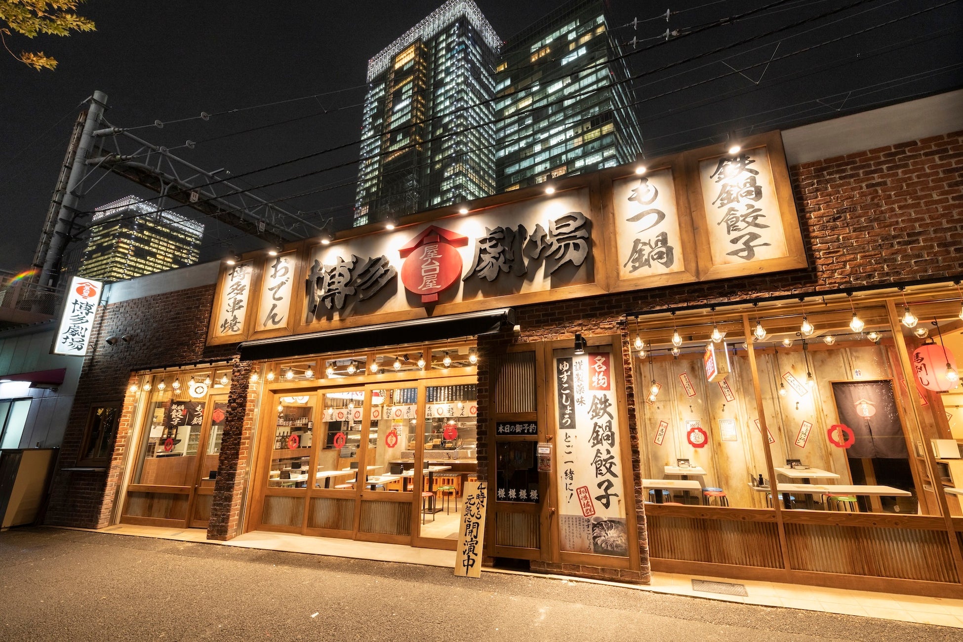 一都三県に50店舗を展開する、九州博多の風物詩“中洲の屋台村”の雰囲気と名物料理が楽しめる大衆居酒屋です。店内は博多中洲の屋台村を完全再現。祭り囃子をBGMに、粋の良いスタッフが創る熱気の渦を体感できる“劇場型酒場“です。名物「鉄鍋餃子」をはじめ、もつ鍋やおでんなど、博多中洲の屋台をはしご酒するように、博多名物をお楽しみいただけます。元気、活気、笑顔溢れる空間をお楽しみください。