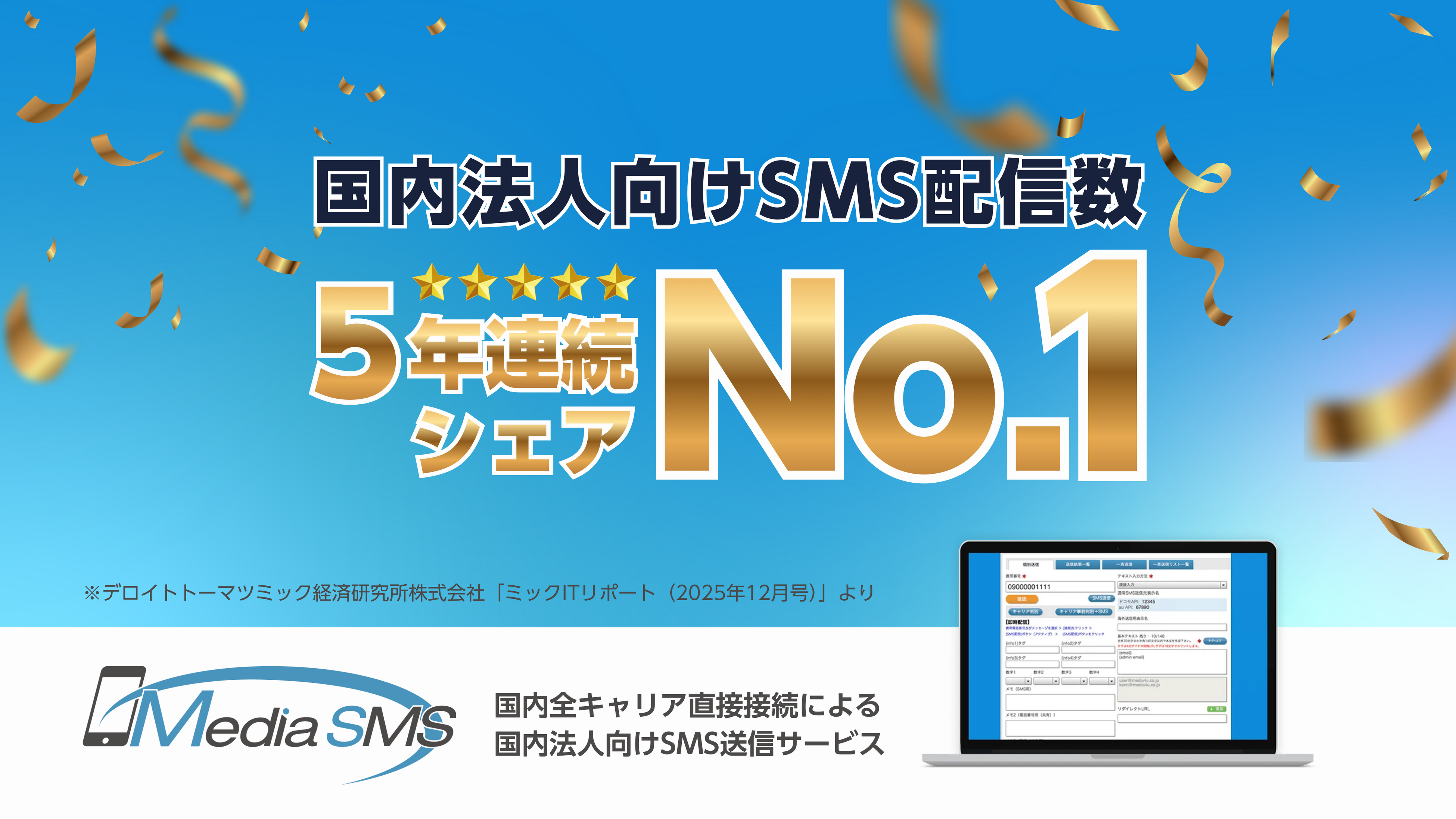 株式会社ファブリカホールディングスの完全子会社、株式会社メディア4u(本社:東京都港区、代表取締役社長:岩館徹)が提供する法人向けSMS送信サービス「メディアSMS」は、国内法人向けSMS配信数シェアで5年連続No.1(2021〜2025年度)を達成しました。