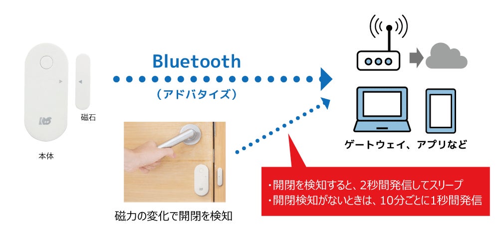 本製品はドアなどの開閉を検知し、決まったフォーマットのデータをアドバタイズで発信します。ペアリングなどの手続きなくデータの取り出しがおこなえるため、ゲートウェイ経由でのクラウド伝送やエッジ処理、スマホアプリでの処理を安定的におこなうことができます。