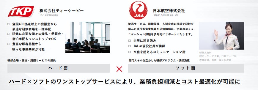 株式会社ティーケーピー(本社:東京都新宿区、代表取締役社長:河野 貴輝、以下TKP)は、日本航空株式会社(本社:東京都品川区、代表取締役社長:赤坂 祐二、以下JAL)と業務委託契約を締結し、企業向けのコミュニケーション特化研修プログラムを提供いたします。