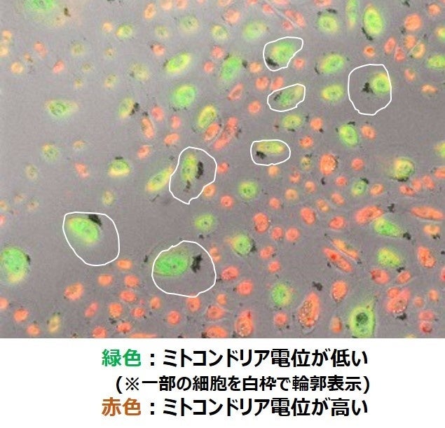顕微鏡でメラニンを取りこんだ細胞を観察すると、メラニンを「蓄積する細胞」と「蓄積しない細胞」が存在しました。メラニンを蓄積している細胞では、エネルギー代謝指標となるミトコンドリア電位が低く、細胞分裂も低下していました。さらに、SA-β-GALという老化マーカーで染色されたことから、この細胞の正体は、細胞老化※3した老化ケラチノサイトであることがわかりました。老化細胞はエネルギー代謝が低いため、メラニンを取りこんだ後のエネルギー代謝の活性化が起こりづらいと予想できます。これらの結果から、老化ケラチノサイトがメラニンを取りこみ、ターンオーバーされずに肌の内部に居座り続けることが、老人性色素斑がいつまでも消えない理由のひとつであると考えられます。