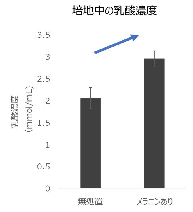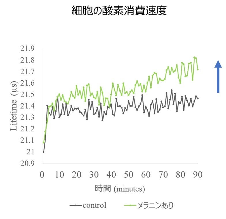 エネルギー代謝によって変動する成分を調べてみたところ、元気な表皮細胞(ケラチノサイト※1)ではメラニンを取り込むと培地中の乳酸や細胞の酸素消費速度が増加しました。これは、エネルギー代謝が活性化したことを示しています。一方、エネルギー代謝の活性化を抑制すると、細胞内にメラニンが蓄積することがわかりました。このことから、メラニンを取りこんだ後のエネルギー代謝の活性化が、メラニンを蓄積させないための重要な鍵であることがわかりました。この結果から、元気な細胞が多い肌では、細胞がメラニンをたくさん取り込んでもエネルギー代謝が活性化することにより新陳代謝を促し、最終的にはメラニンを排出させることができるため、メラニンが肌にとどまらないと考えられます。