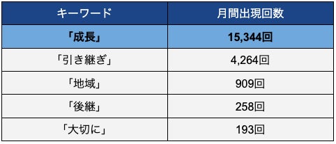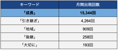 最多の「成長」は月間15,000回を超え、売り手が事業の将来的な発展を最も重視していることがわかります。「引き継ぎ」「地域」「後継」「大切に」が上位に並ぶことからも、金額や条件面だけでなく、事業への愛着と後継者への期待が、オファーの動機の中核を成していることが読み取れます。
