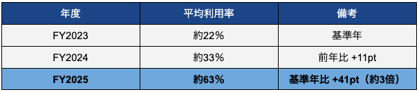 その結果、同機能の利用率はFY2023の約22%からFY2025には約63%へと3年で約3倍に急伸し、1案件あたり平均72名の買い手候補にオファーを送信していることが判明しました。
