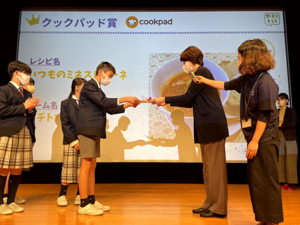 受賞者コメント:「班のメンバーがそれぞれの家庭で食べているレシピを持ち寄って改良しました。味が濃すぎないように気を付けてトマトが苦手な人も食べやすくしたことを評価してもらえてうれしかったです。「いつも」食べている料理なので、気軽に作ってもらえるといいなと思っています」