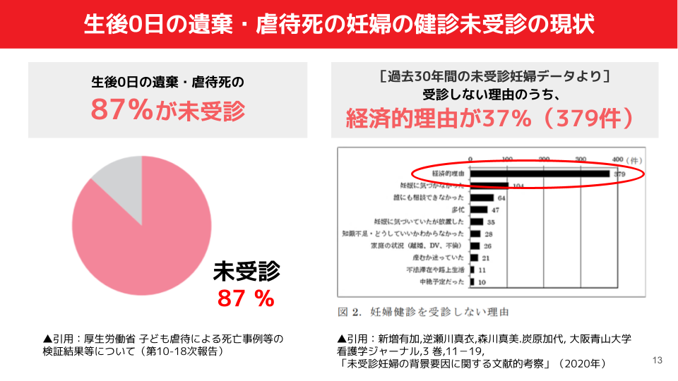 フローレンスのにんしん相談に限らず、厚生労働省の「子ども虐待による死亡事件等の検証結果等について(第10-18次報告)」のデータでも、0日児死亡ケースの中で「未受診」の割合が87%にものぼっています。また、妊婦健診を受診しない理由として、経済的理由を挙げる人が約4割という調査結果もあります。