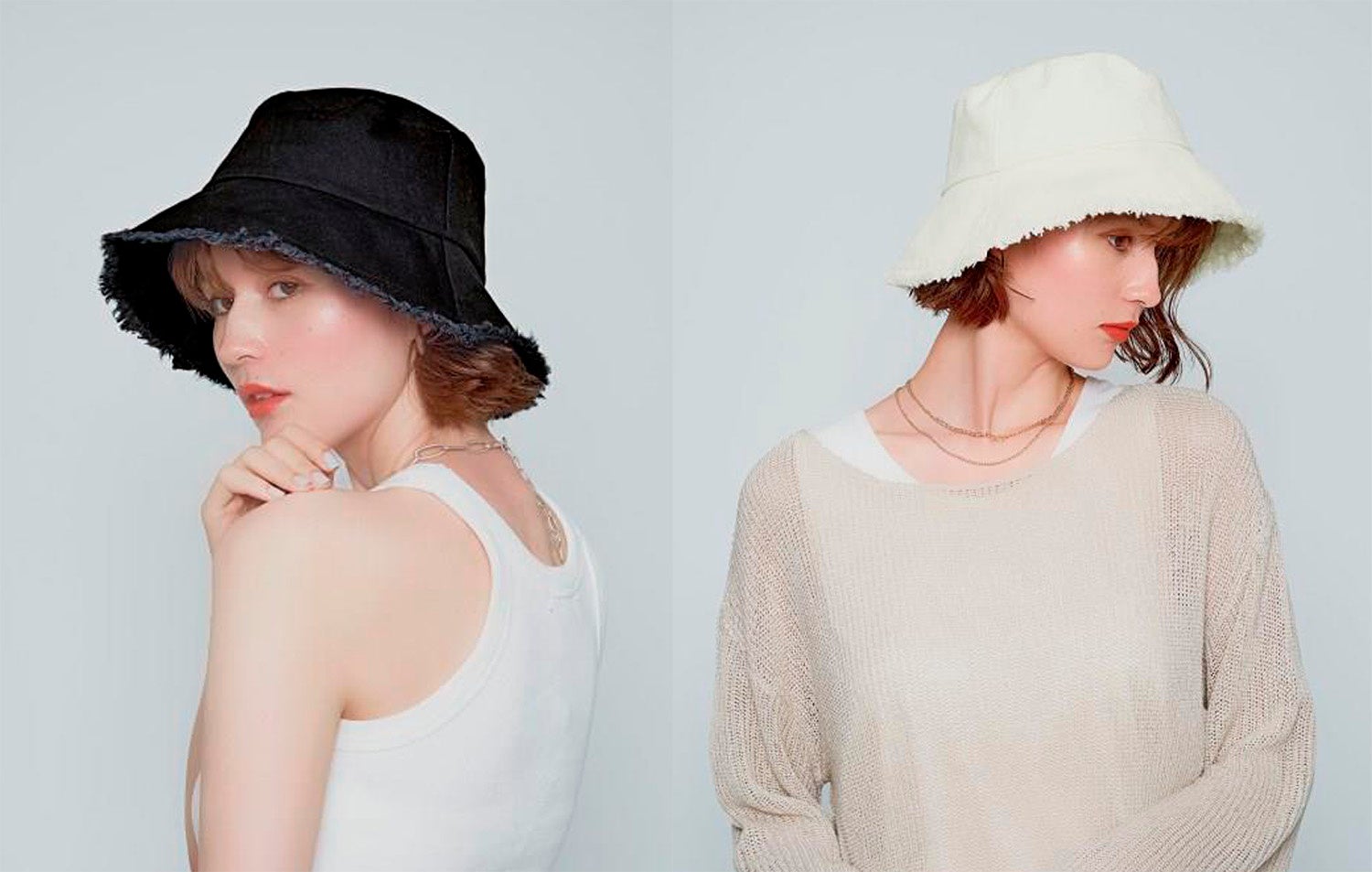 長めのツバで顔回りをカバーするバケットハット。ダメージ加工でおしゃれのアクセントに。