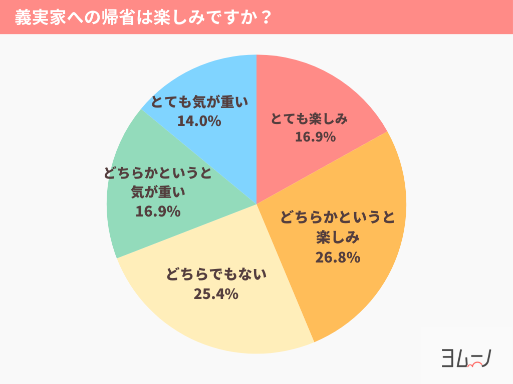 「とても楽しみ」が16.9%、「どちらかというと楽しみ」が26.8%。合わせると43.7%が義実家への帰省を楽しみにしていることが分かりました。