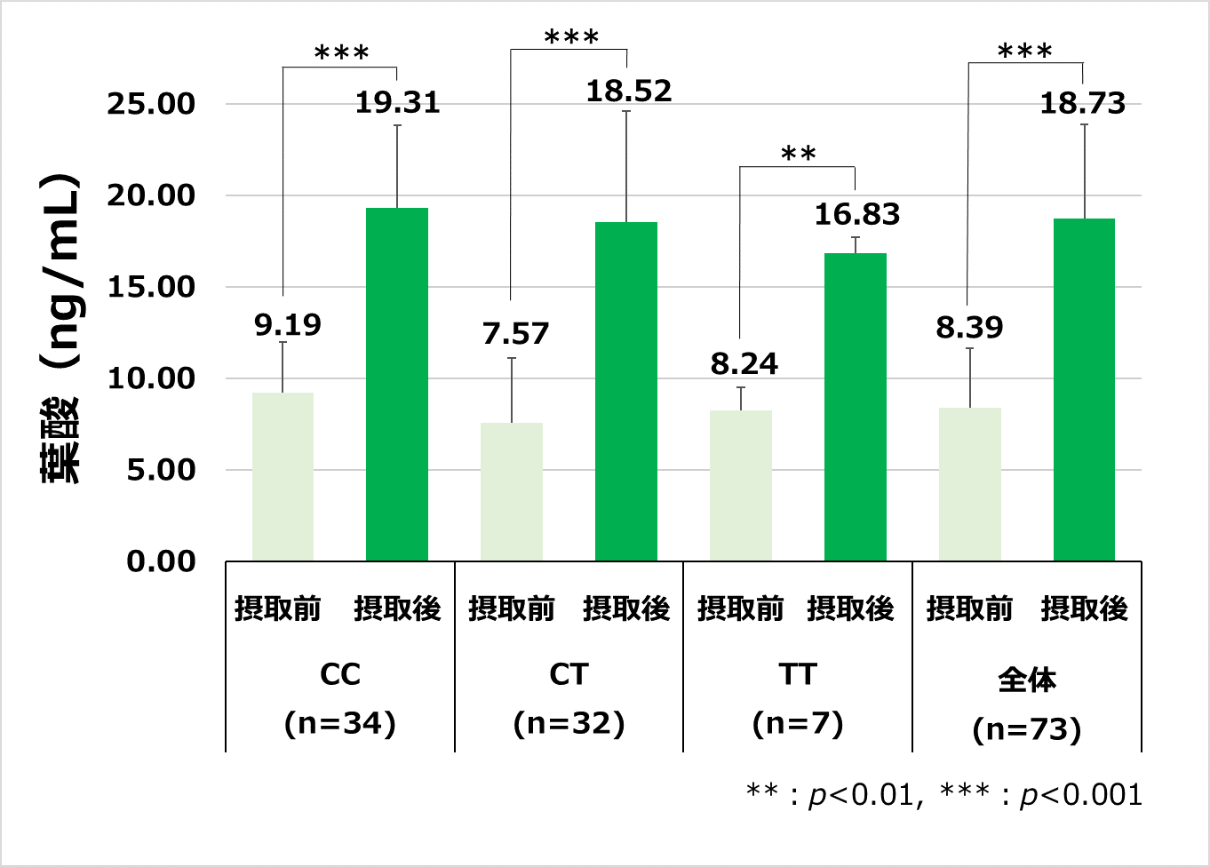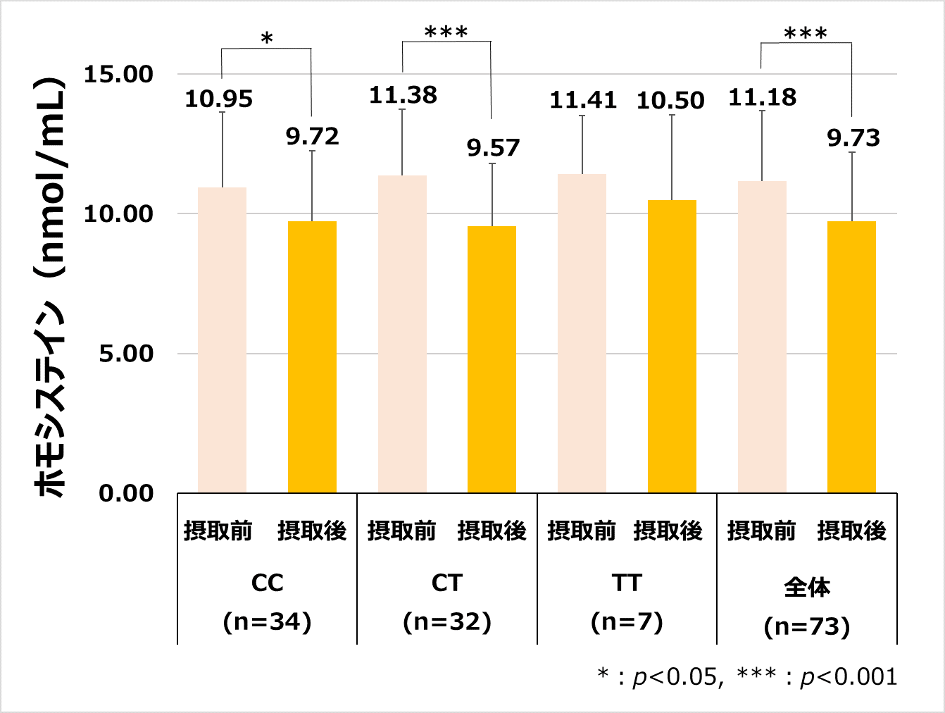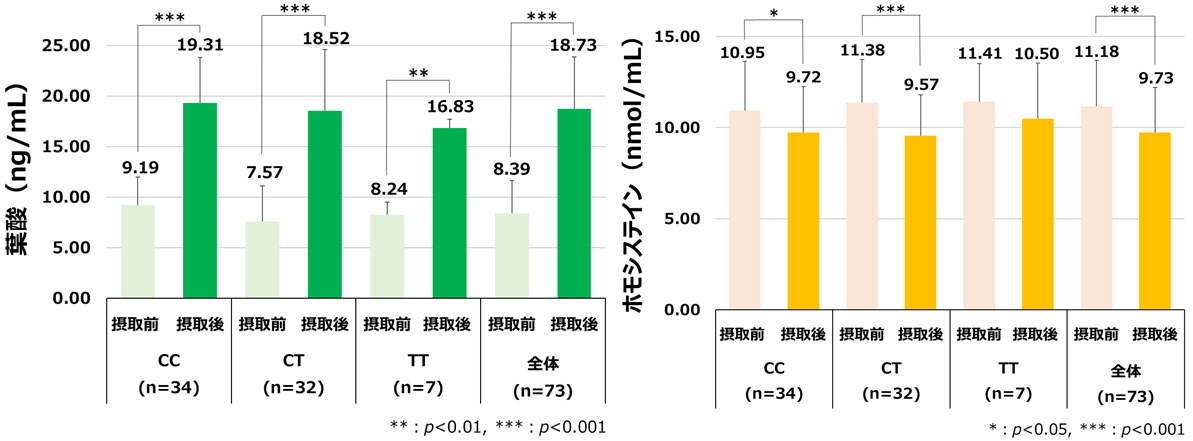 【図1:サプリメント摂取前後の血中の葉酸値とホモシステイン値の変化】