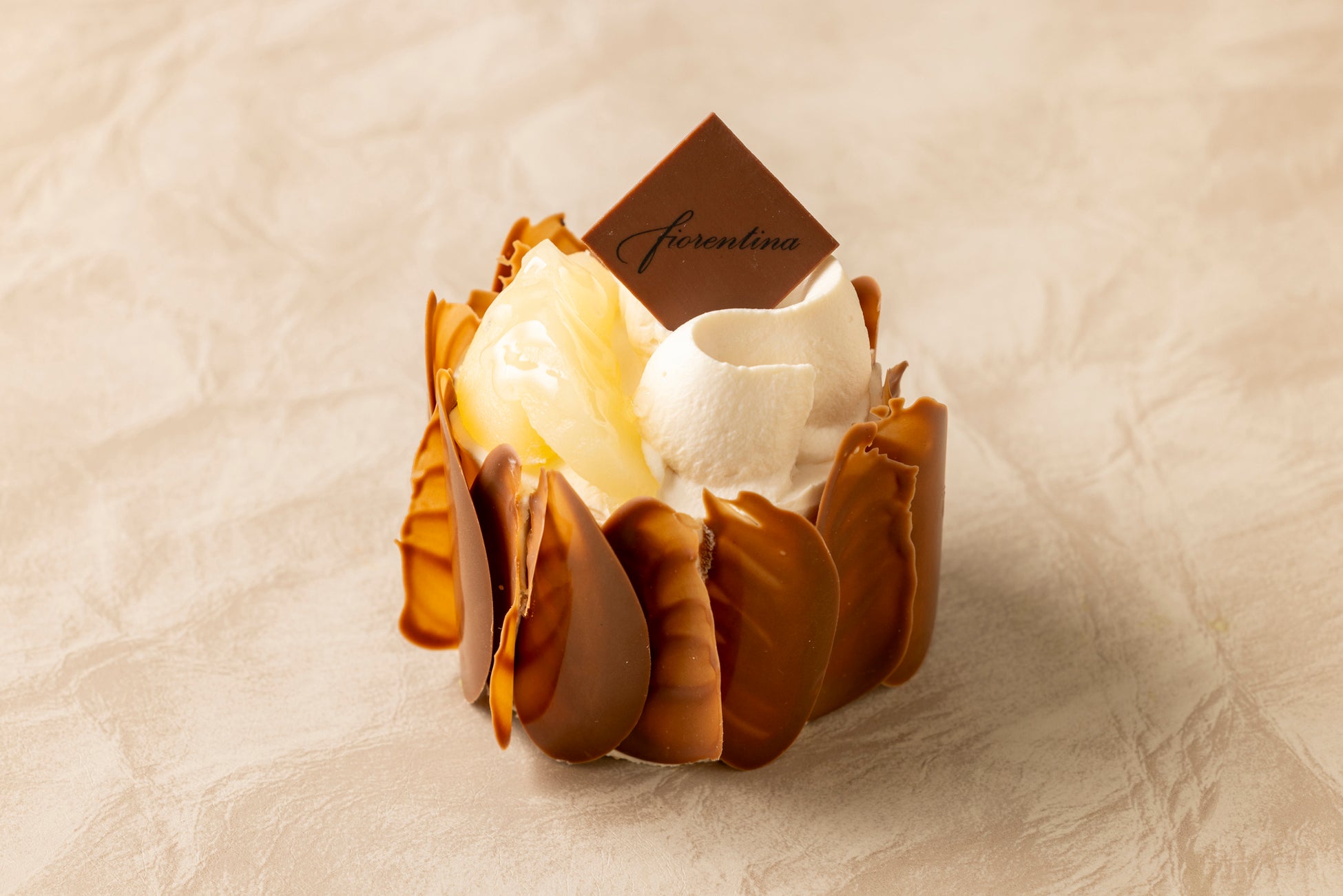 貝のような美しい見た目で、「ひだを何枚も重ねた」という意味の「スフォリアテッレ」は、イタリア・ナポリ地方発祥の焼き菓子です。薄く重なり合ったパイの層が特徴の生地の中には、リコッタチーズとアーモンドクリーム、コンポートしたマロンを詰めます。軽快な歯ざわりとなめらかなクリーム、風味豊かなマロンの絶妙なハーモニーをお楽しみください。