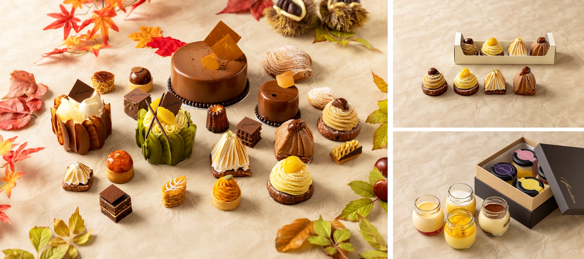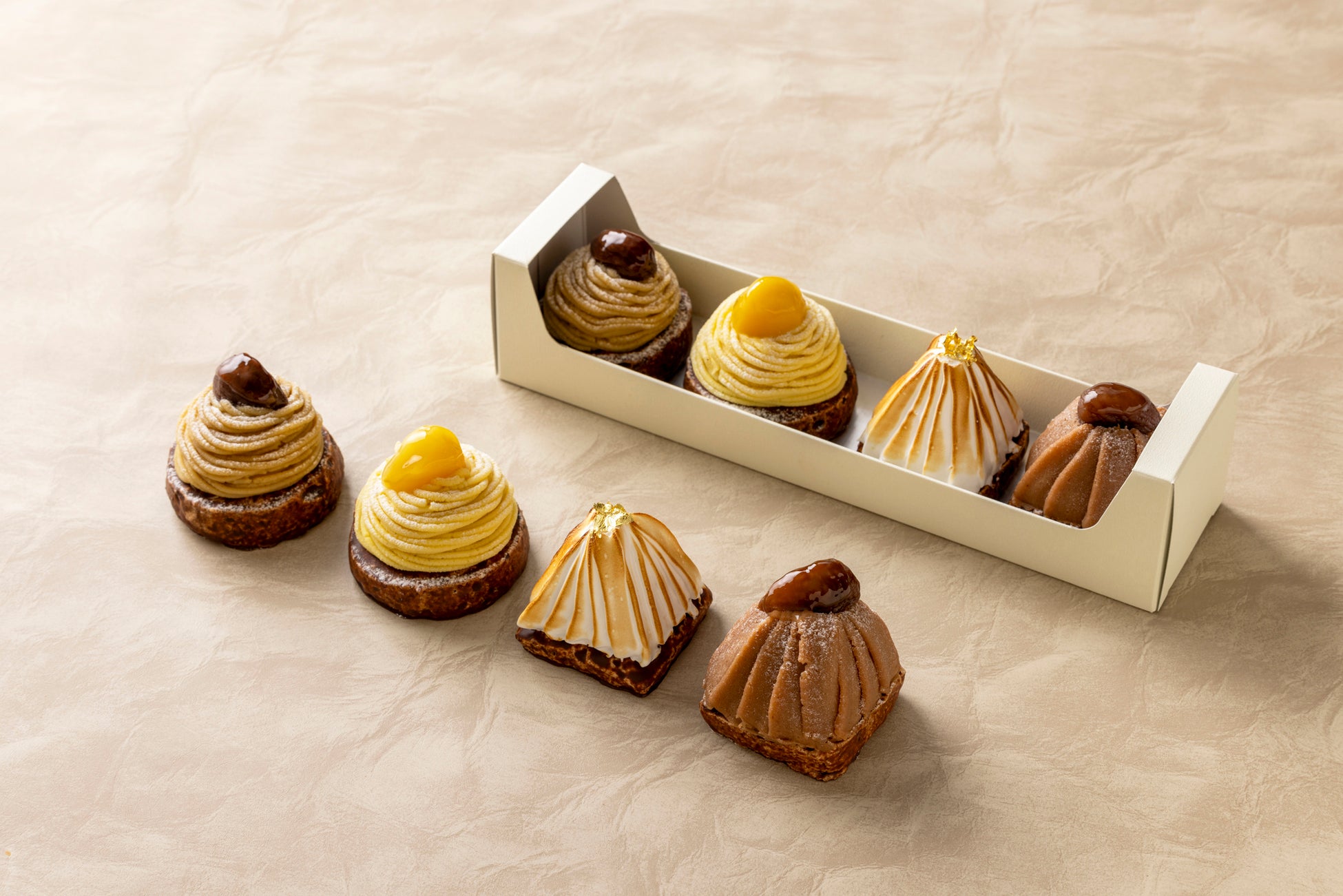 毎年ご好評をいただいている秋限定のスイーツ&ブレッドセレクションから、やさしい甘みの2種類の国産栗と、濃厚な味わいのイタリア、フランス産栗の計4種類の栗の食べ比べが楽しめるモンブランを新作としてご用意いたします。和栗や洋梨、パンプキンなど秋の味覚を使用したプティフール(小菓子)6種類を詰め合わせるセットに加え、ティラミスやパンプキンプリンなど4種類のグラススイーツの詰め合わせなど、ご自宅用にはもちろん、手土産にも最適なボックス入りスイーツも登場いたします。