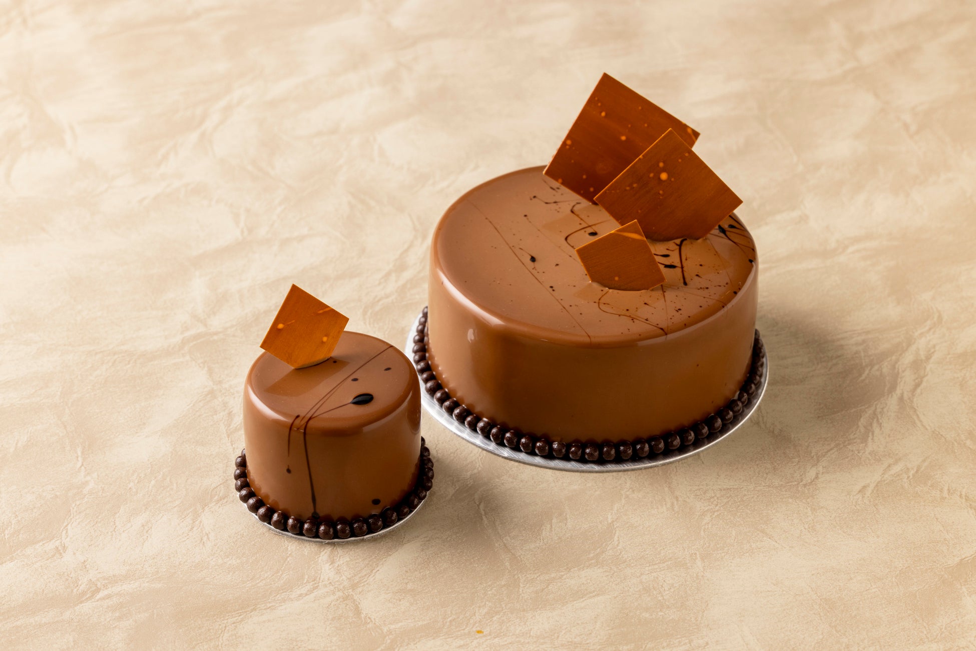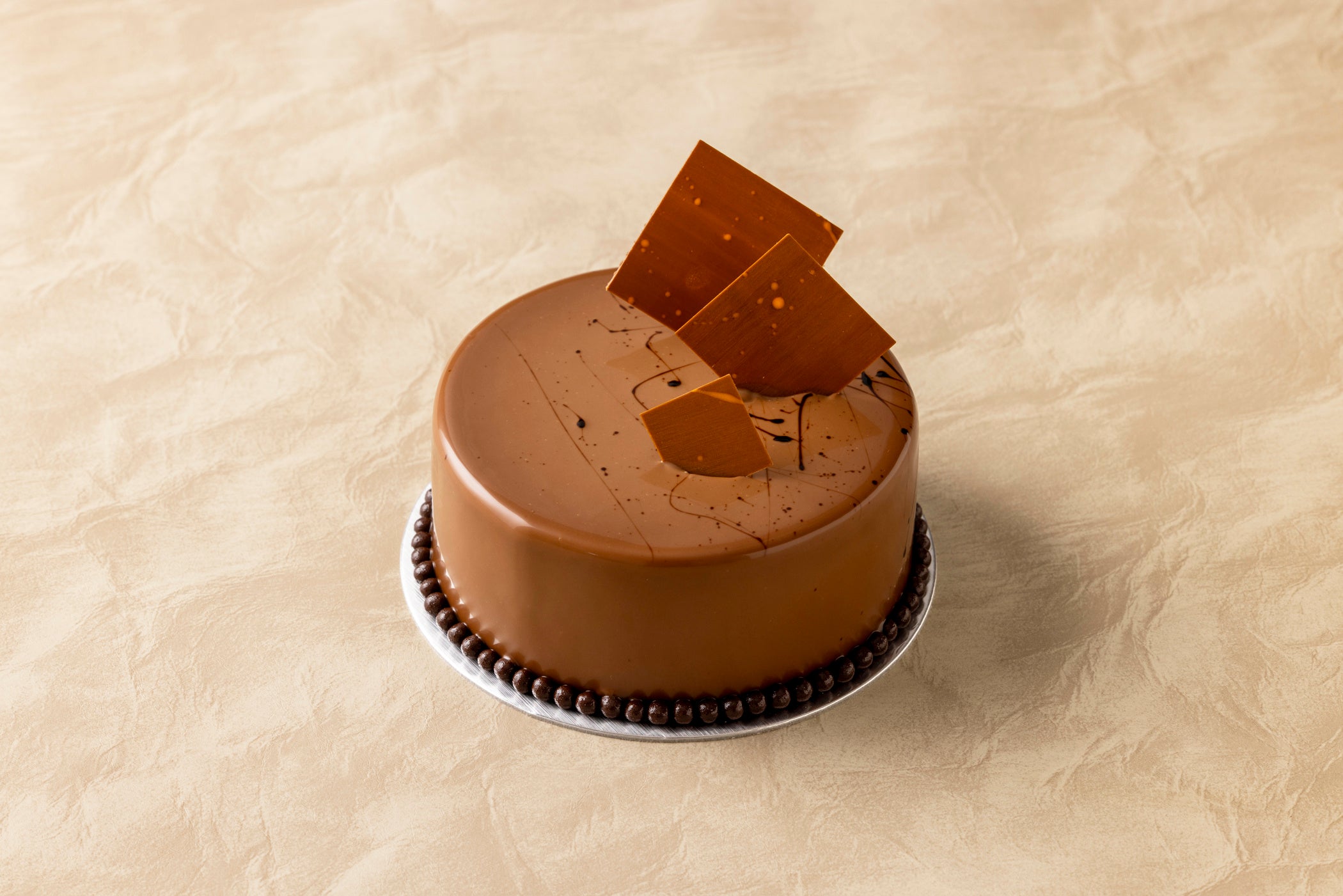 洋梨のコンポート入りジュレや香ばしいヘーゼルナッツ生地、バニラのような甘みとスパイスが香るトンカ豆をつかったブリュレ、サクサク食感のカカオクランブルを、なめらかなくちどけのキャラメルムースで包み込みます。表面をキャラメルチョコレートでコーティングした艶やかで洗練されたムースケーキは、手土産にもおすすめです。
