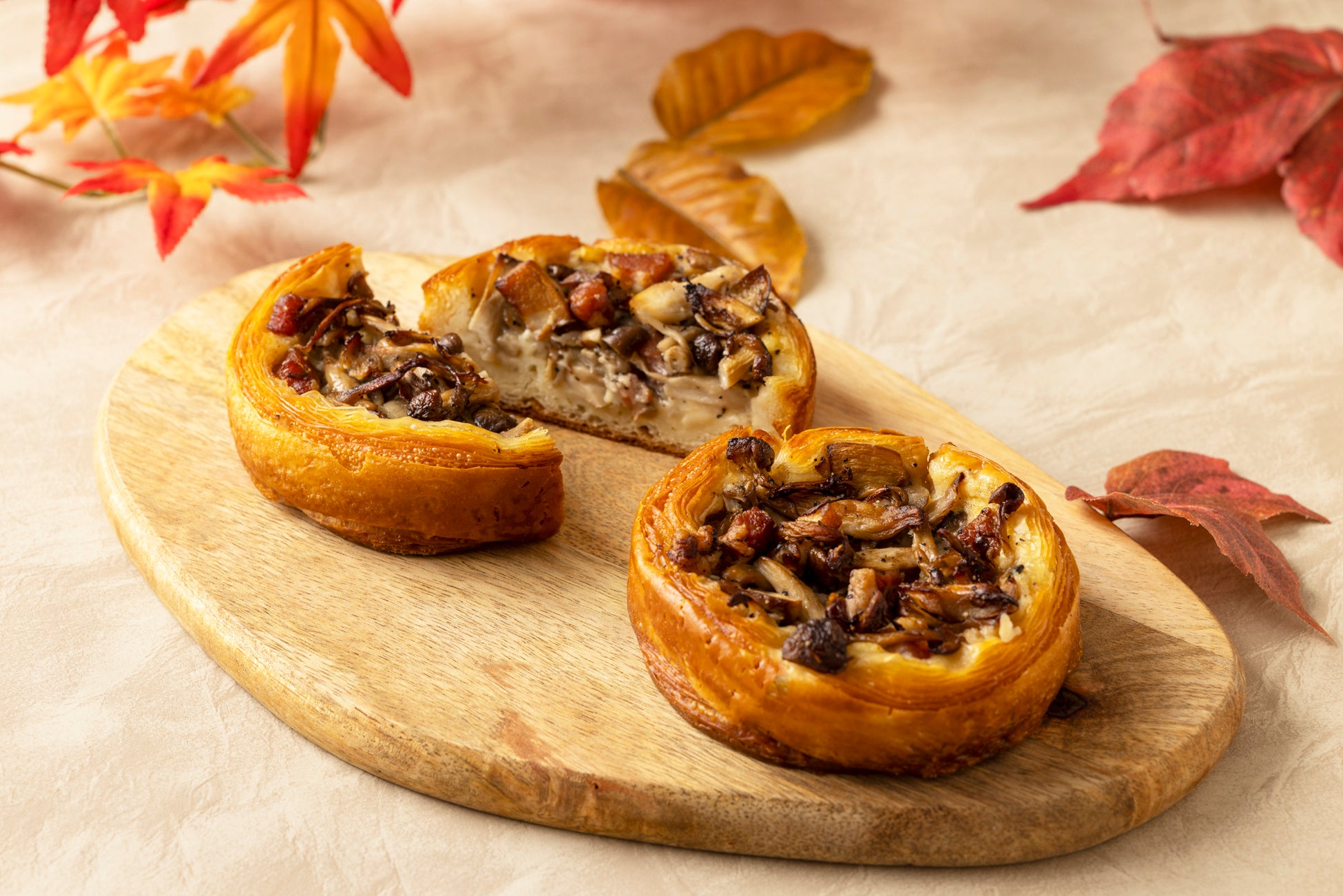 デニッシュ生地にベシャメルソースを絞り、ガーリックオイルで炒めた舞茸、しめじ、エリンギをたっぷりとのせて焼き上げます。ガーリックとブラックペッパーの香りがきのこの旨味を引き立てる秋ならではのブレッドです。