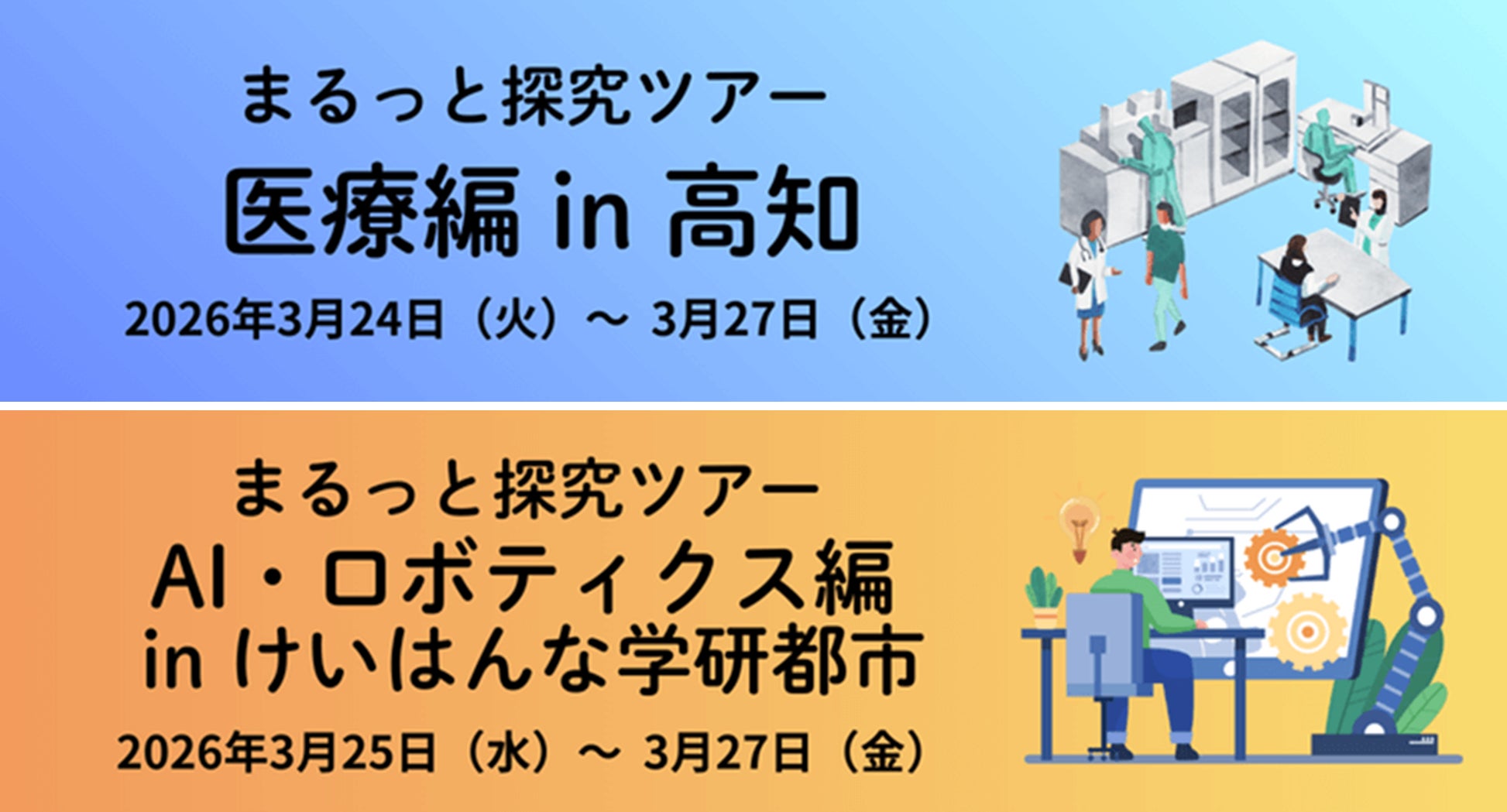 河合塾グループは、新中2生から新高3生を対象に、宿泊型の探究学習プログラム「まるっと探究」2026年春企画として、「まるっと探究ツアー 医療編 in 高知(医療のリアル 探究フェローシッププログラム)」ならびに「まるっと探究ツアー AI・ロボティクス編 in けいはんな学研都市」を開催します。