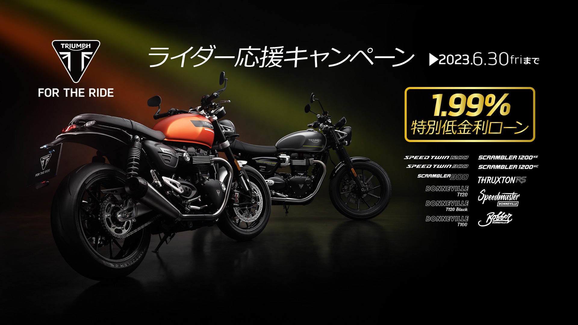 内容:キャンペーン期間中、全国のトライアンフ正規販売店にて対象車両をご成約、且つローン契約完了していただいたお客様に、「1.99% 特別低金利ローン」をご提供いたします。