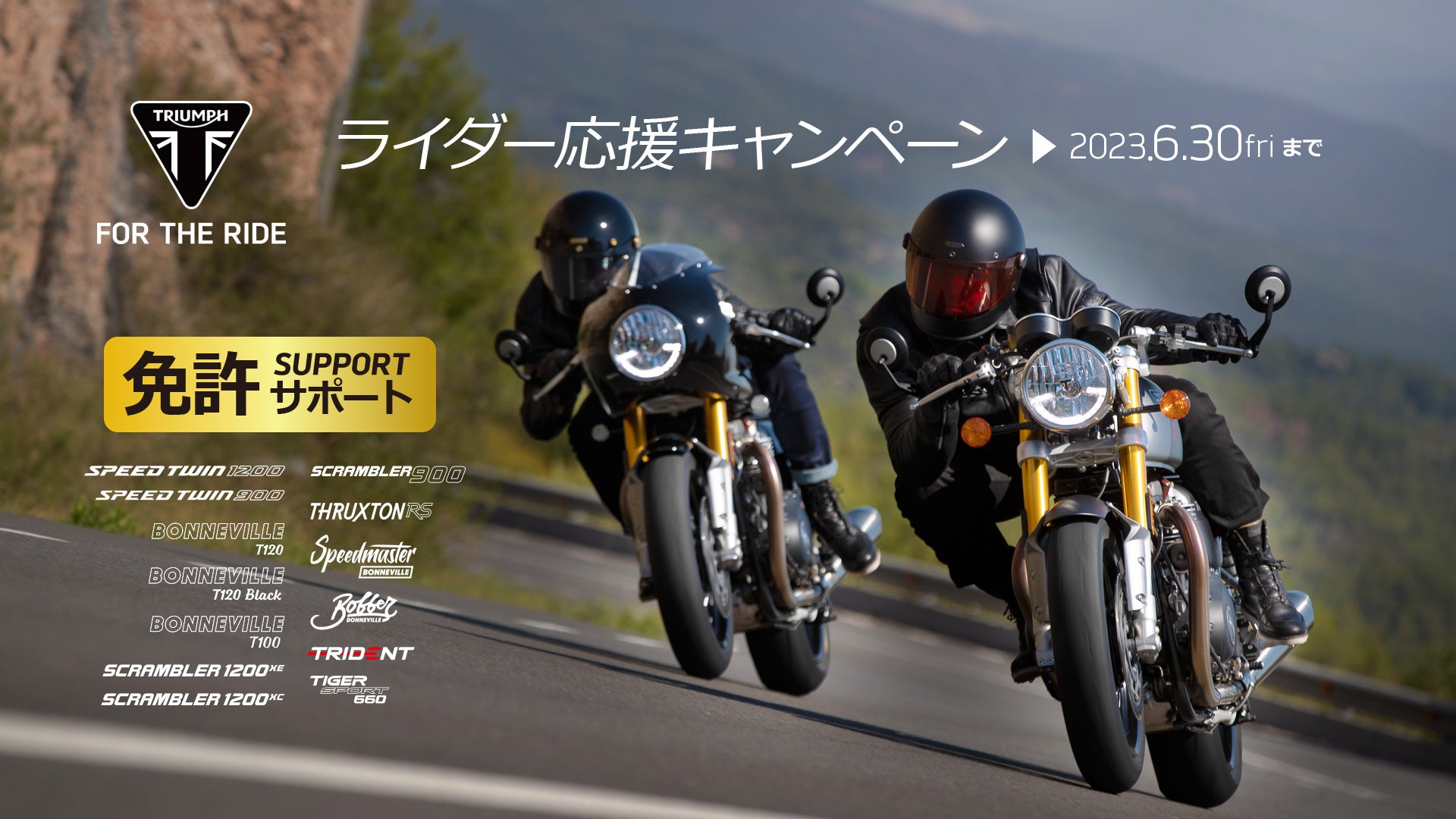 内容:キャンペーン期間中、全国のトライアンフ正規販売店にて対象車両をご成約・ご登録された方、且つ2023 年1月以降に大型自動二輪 MT 免許を取得された方、または 2023 年9月末までに取得される方を対象に、大型自動二輪MT 免許取得費用相当分としてそれぞれ