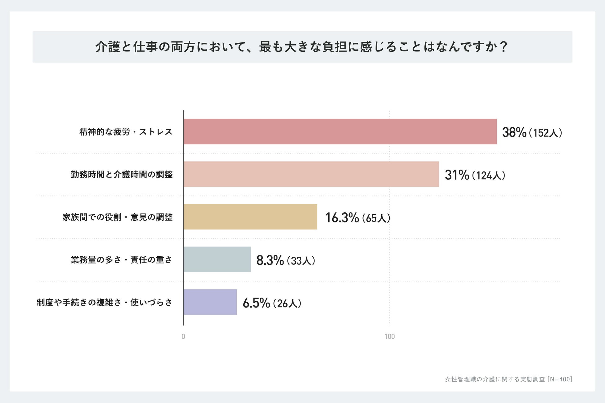 調査の結果、介護をしている女性管理職・リーダーのうち4割強が一人で介護を担い、6割以上が働き方を調整した経験を持つことが分かりました。