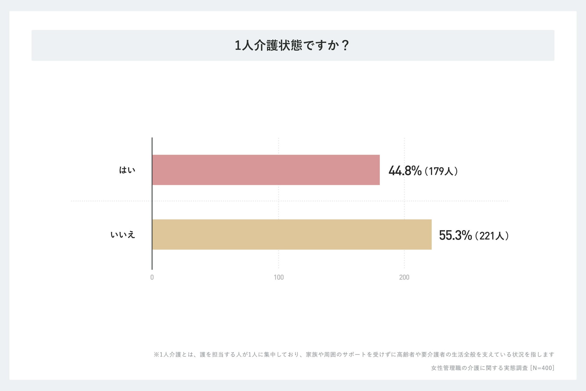介護を担っていると回答した女性管理職・リーダーのうち、現在、一人で介護を担っている「ひとり介護状態」と答えた人は400人中179人で、約45%にあたりました。