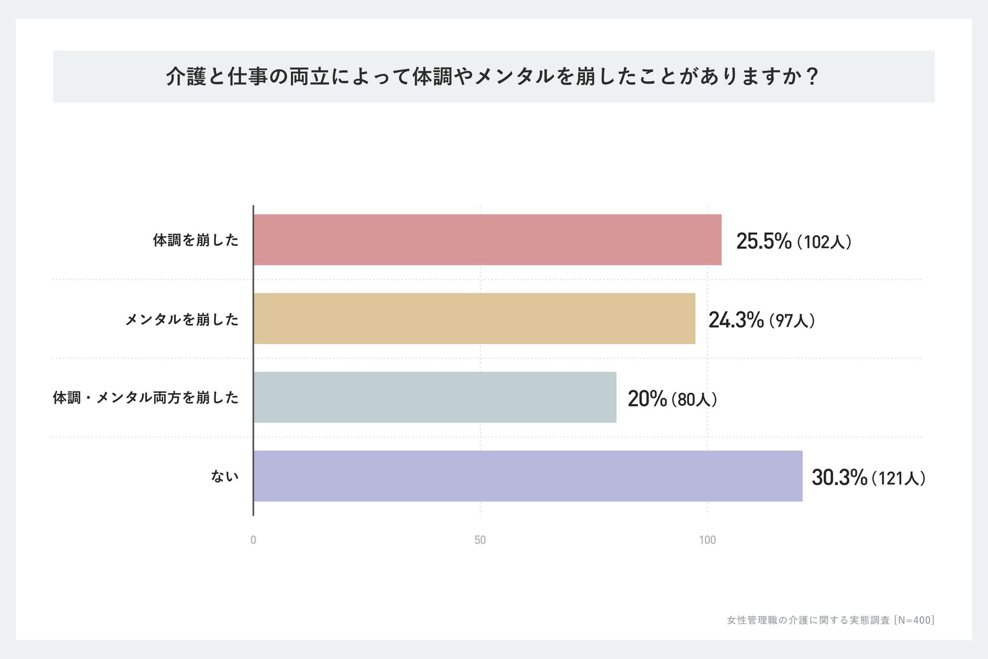 介護と仕事との両立によって、102人は体調を崩し、97人はメンタルを崩したと回答しています。両方崩したという人も80人おり、何らかの不調を伴った人は全体の7割に上りました。