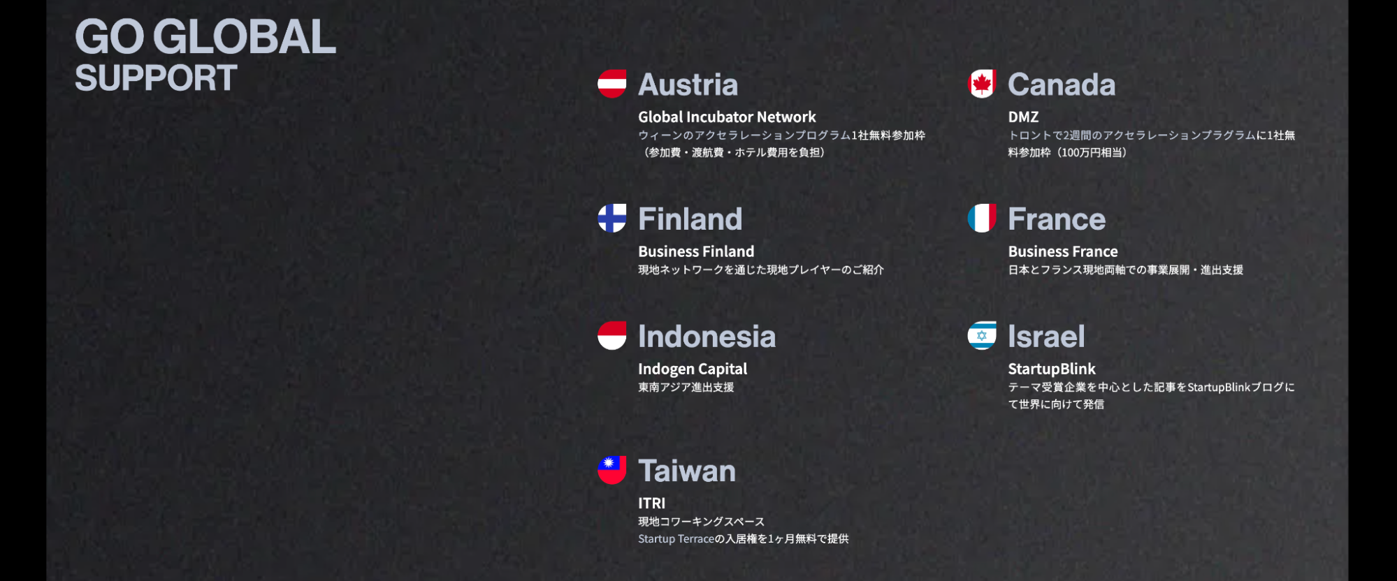 そして、今年はスポンサー企業に加えて、協力パートナーとして各国の大使館などに参画いただき、海外イベントへの参加をはじめ、世界各国のエコシステムへの展開を支援いただく機会提供がございます。GRIC PITCHは引き続き、登壇企業を募集しておりますので、この機会にぜひ挑戦ください。