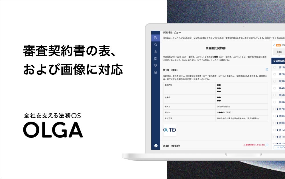 GVA TECH株式会社(本社:東京都渋谷区、代表取締役:山本 俊、以下GVA TECH)は、全社を支える法務OS「OLGA(オルガ)」が、表や画像が含まれる契約書に対応したことをお知らせいたします。