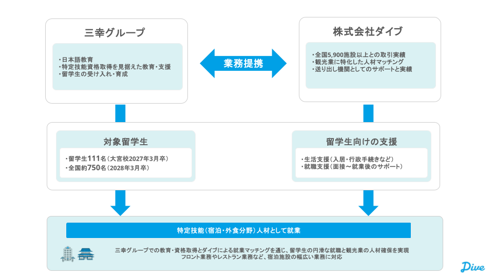 本提携では、三幸グループにおいて宿泊および外食分野の特定技能資格取得を見据えた教育・支援を行い、資格取得後の留学生をダイブが宿泊施設・旅館へ紹介するスキームを構築します。