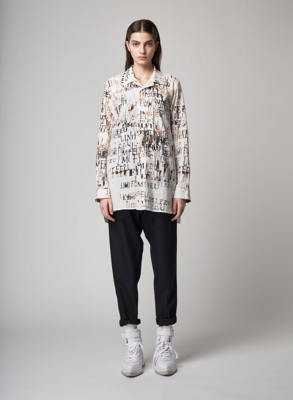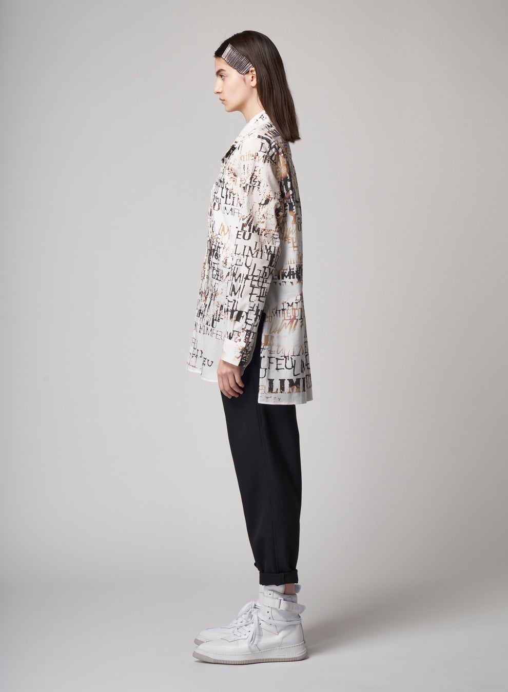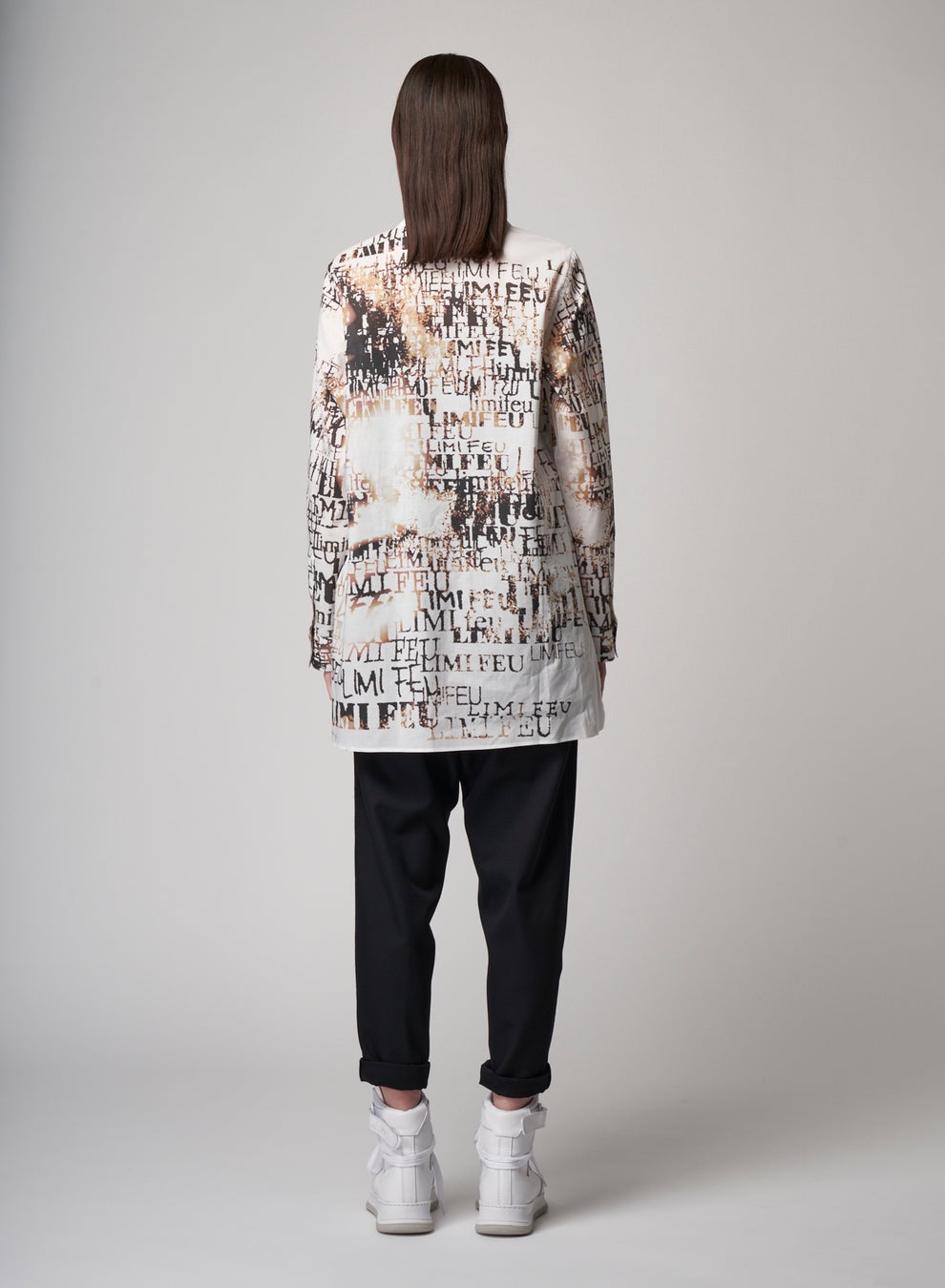 ロゴをあらゆるタイプのデジタルフォントでデザインし、ブランド20年の軌跡をグラフィックで表現したブラウス。ブランド名のfeu(フゥ)はフランス語で火を意味することから、紙が焼けていく時間経過をブラウン系のグラデーションで表し、デザイナーの顔が浮かび上がるコラージュに仕上げています。BLOUSE 72,600 yen