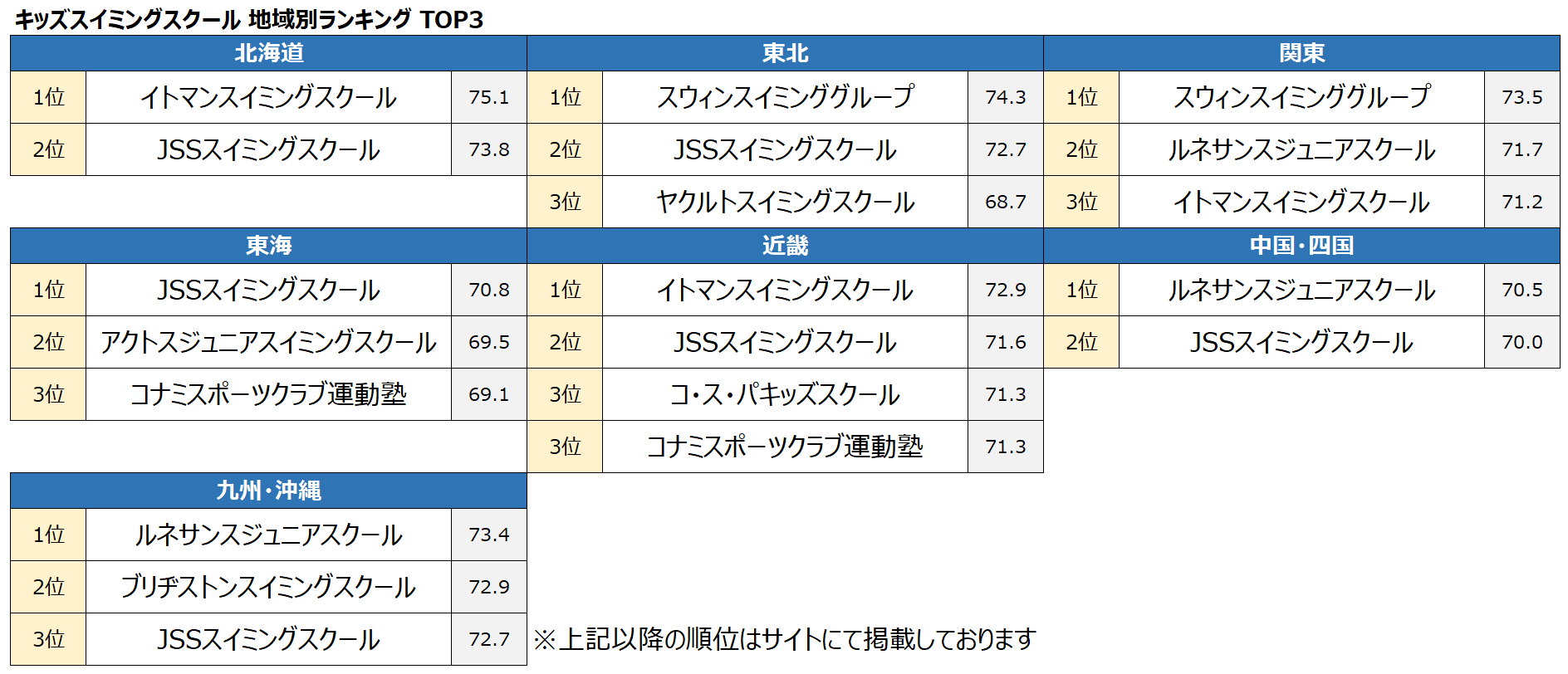 ・地域別では「北海道」「近畿」では【イトマンスイミングスクール】、「東北」「関東」では【スウィンスイミンググループ】、「東海」では【JSSスイミングスクール】、「中国・四国」「九州・沖縄」では【ルネサンスジュニアスクール】がそれぞれ1位を獲得しています