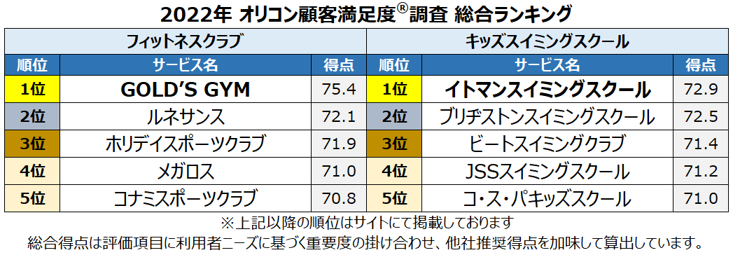満足度の高い『フィットネスクラブ』『キッズスイミングスクール』ランキング|『フィットネス』は【GOLD’S GYM】が総合1位に 『キッズスイミング』は【イトマンスイミングスクール】が総合1位に