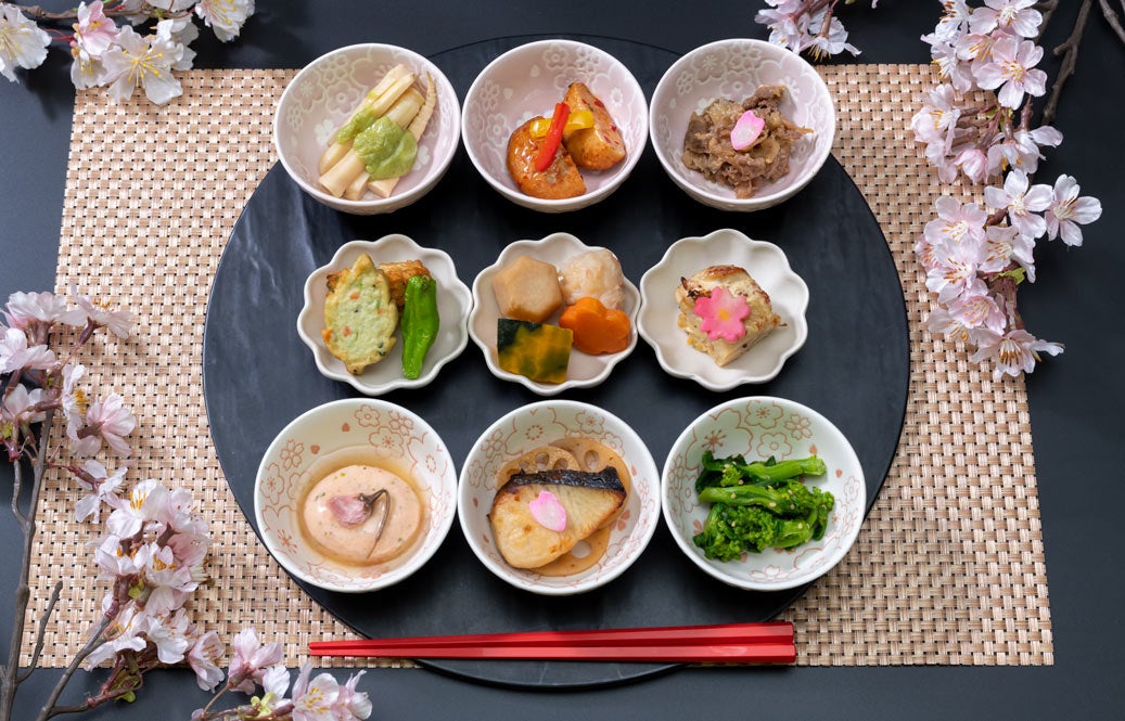 9種アラカルト、ちらし寿司、桜そば、葛餅、お好きなドリンク2本、ランチョンマット