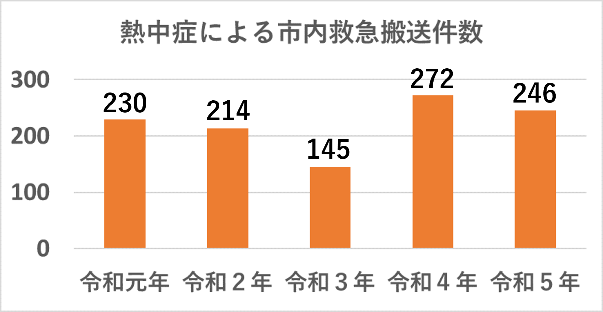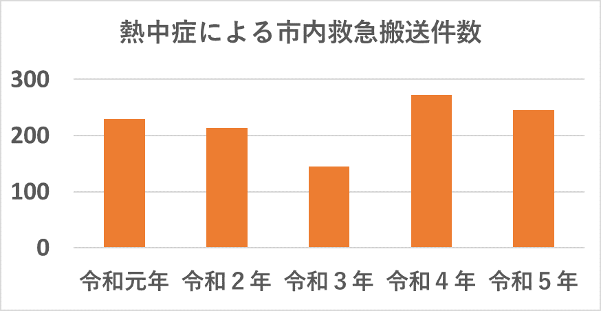◆奈良市においては、庁内関係課や関係機関・団体等が連携して熱中症対策の普及啓発に取り組んできましたが、熱中症による市内救急搬送件数は年間230件前後で推移しています。